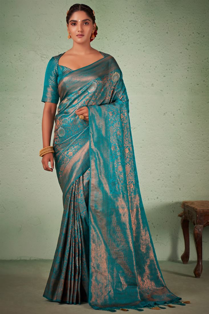 सियान रंग जॉर्जेट कपड़े की आकर्षक बुनाई वाली साड़ी