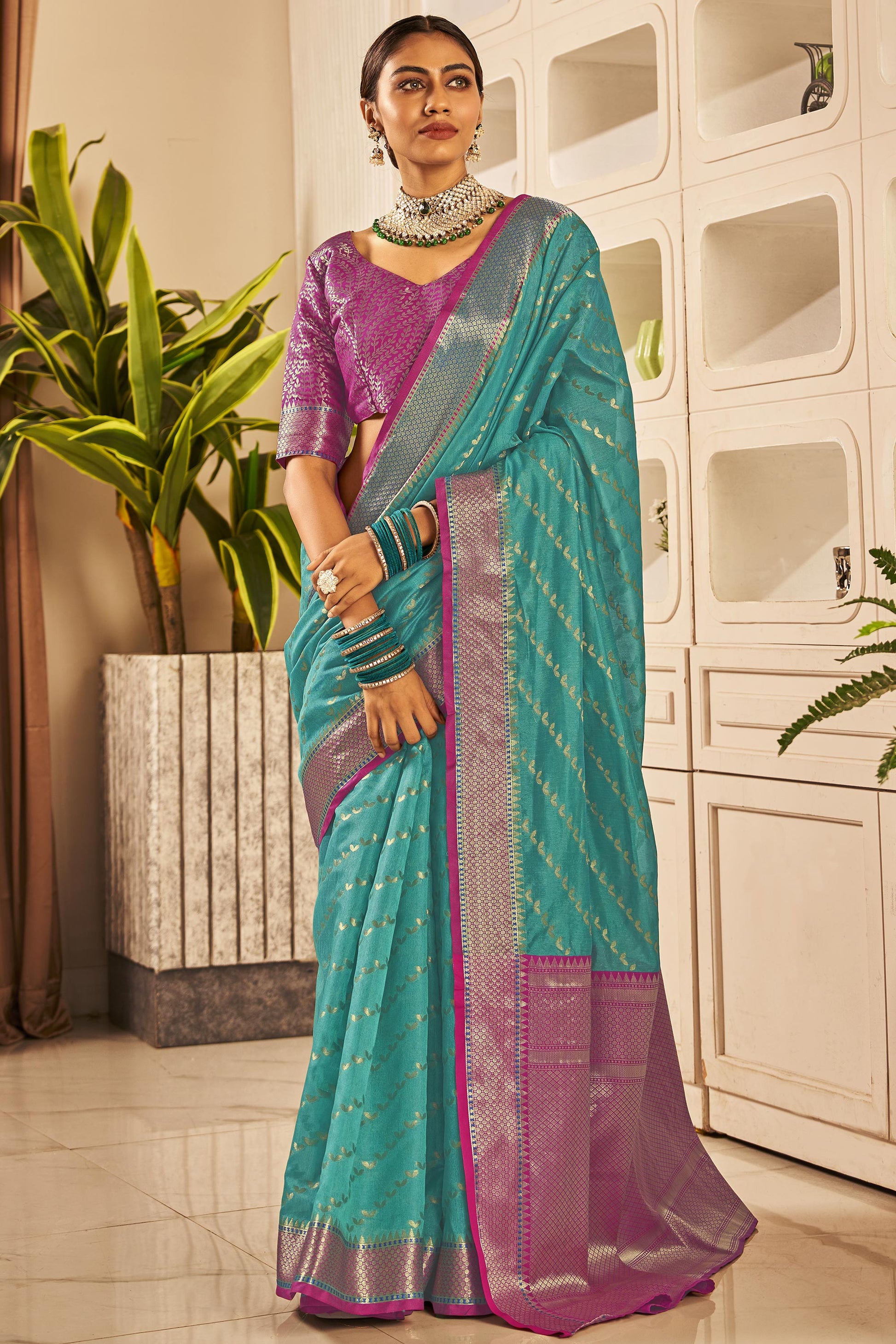 टेक्स्ट ब्लॉक सियान फैब्रिक बुनाई कार्य कला रेशम रंग साड़ी विपरीत ब्लाउज के साथ