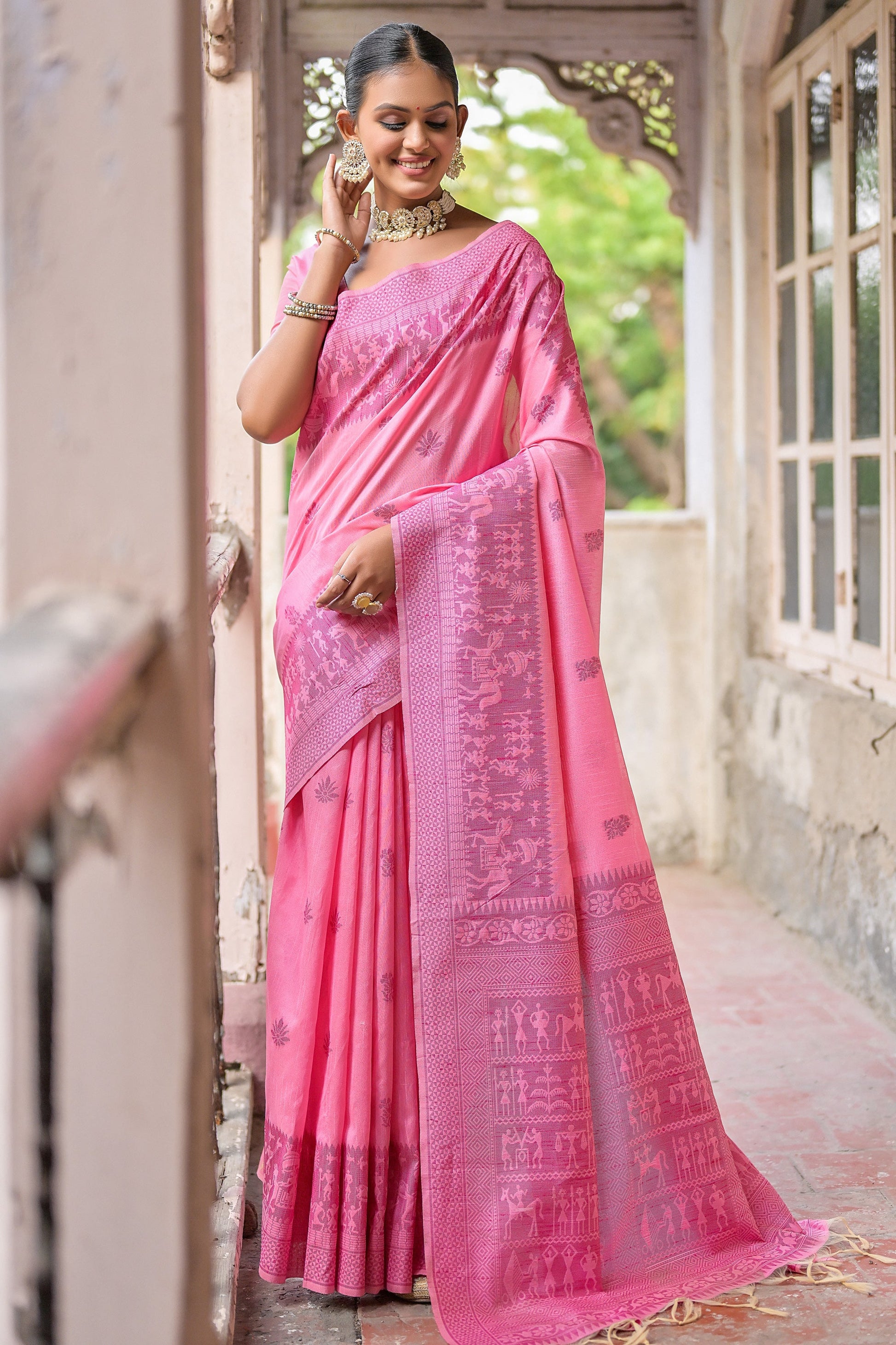 रोज़ाना पहनने वाली हैंडलूम आर्ट सिल्क फ़ैब्रिक गुलाबी बुनी हुई बॉर्डर वाली साड़ी