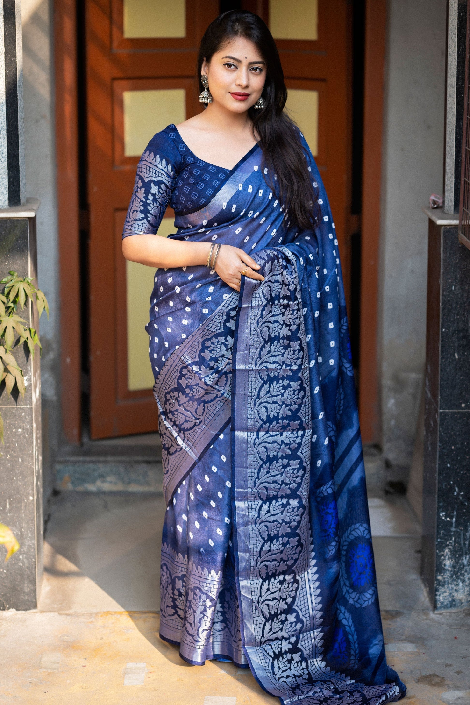 नाज़ुक नेवी ब्लू रंग की बंधनी स्टाइल प्रिंटेड आर्ट सिल्क साड़ी