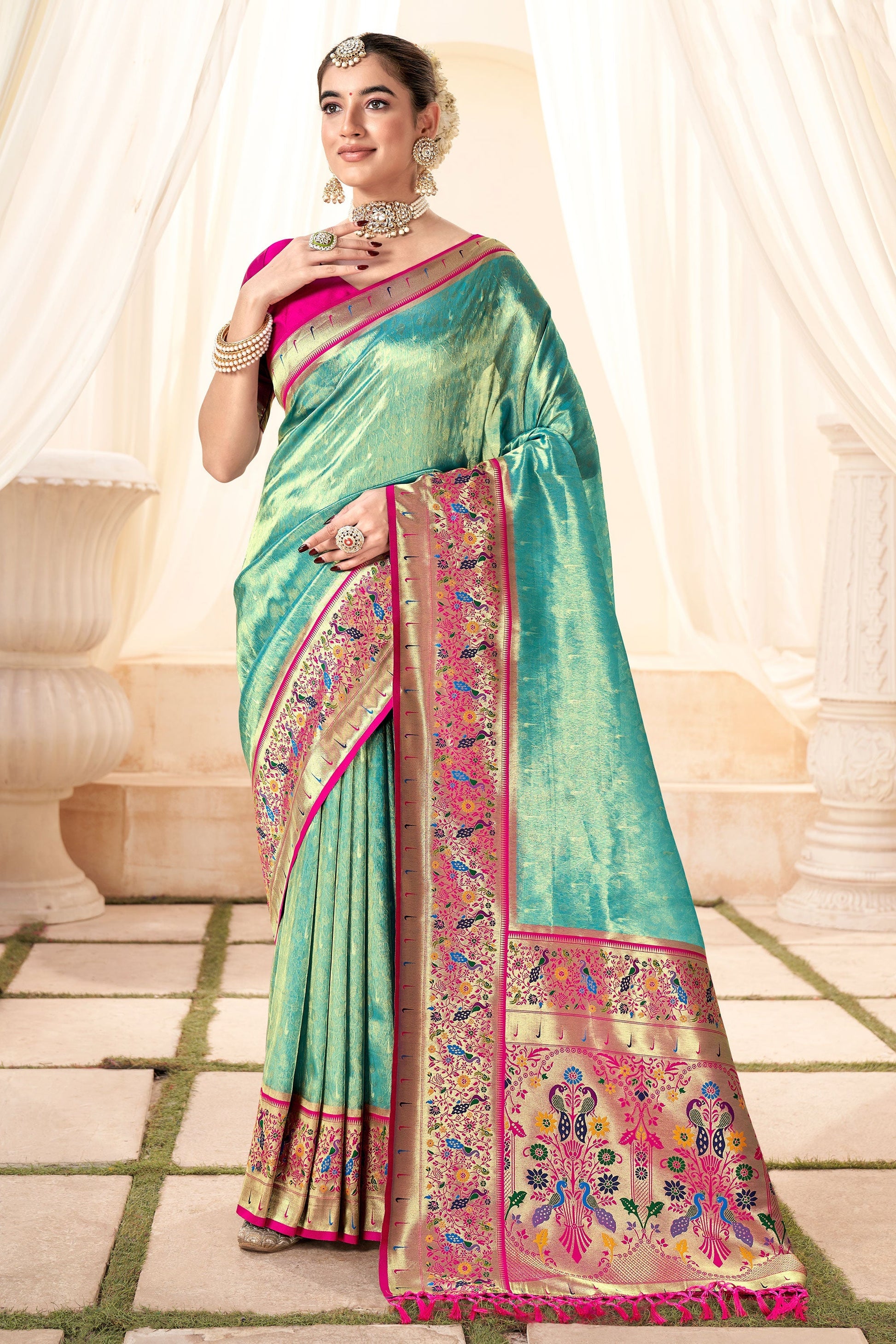 नाज़ुक समुद्री हरे रंग की फंक्शन वियर हैंडलूम सिल्क साड़ी