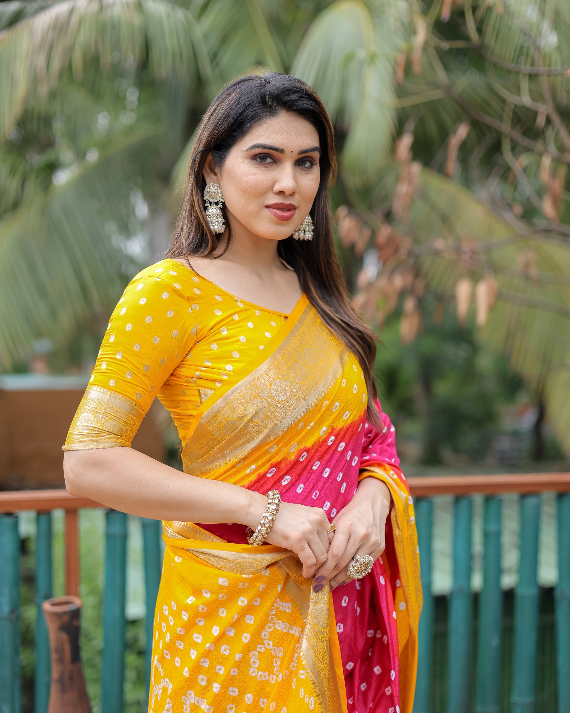 साड़ी का फ़ैब्रिक: डोला सॉफ्ट सिल्क बंधेज साड़ी दो तरफ जरी पैठानी बुनाई बॉर्डर के साथ
