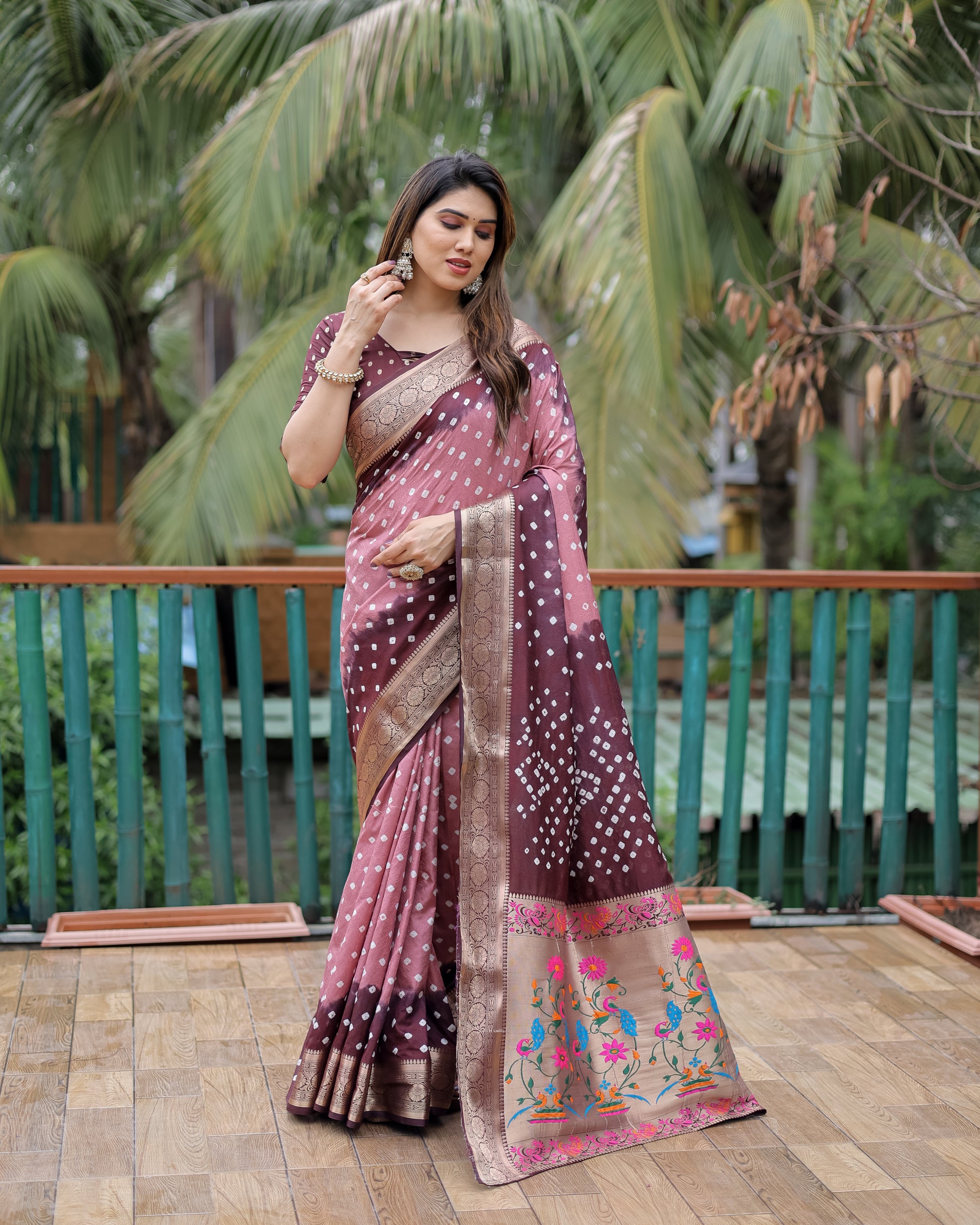 साड़ी का फ़ैब्रिक: डोला सॉफ्ट सिल्क बंधेज साड़ी दो तरफ जरी पैठानी बुनाई बॉर्डर के साथ