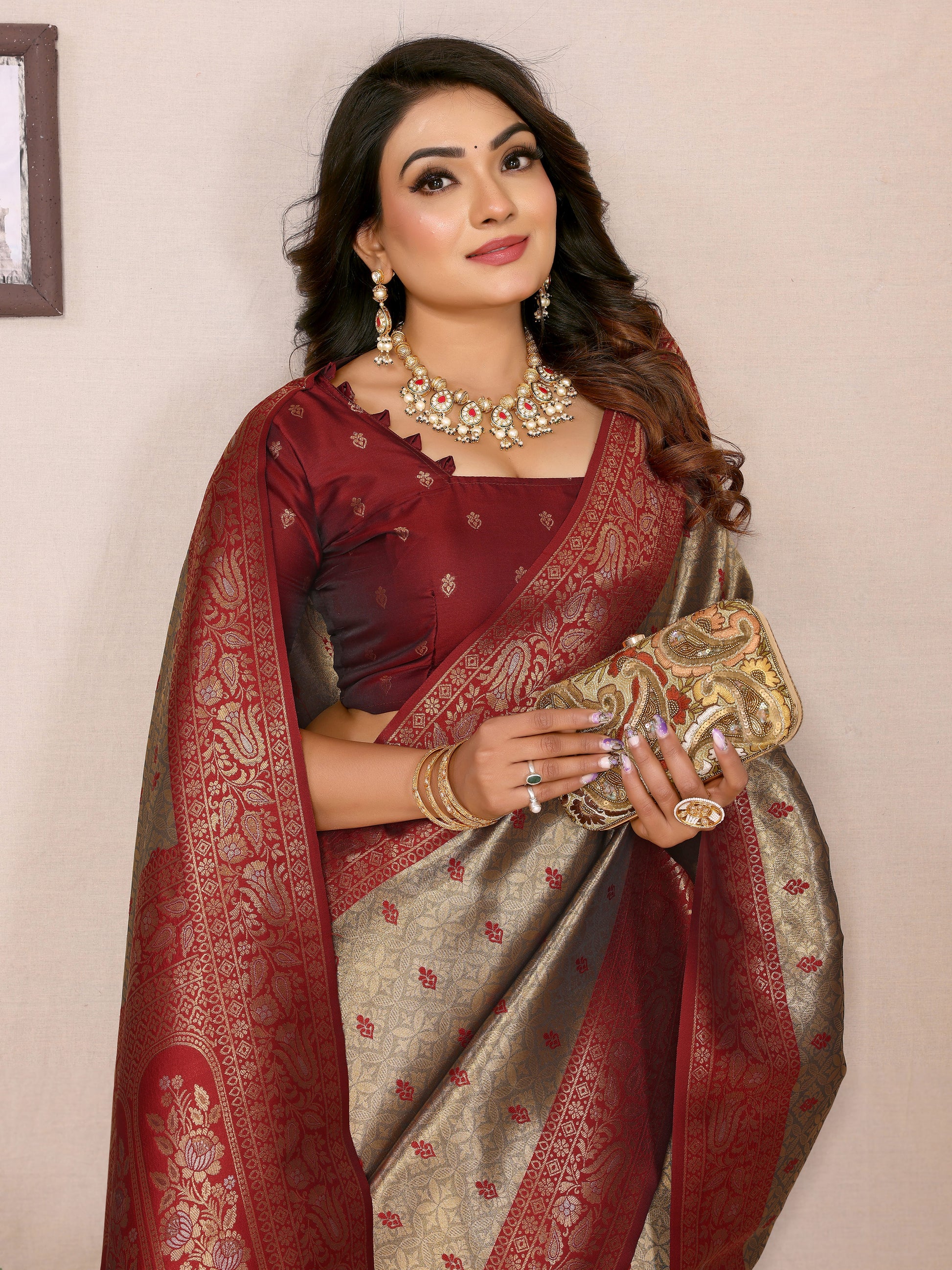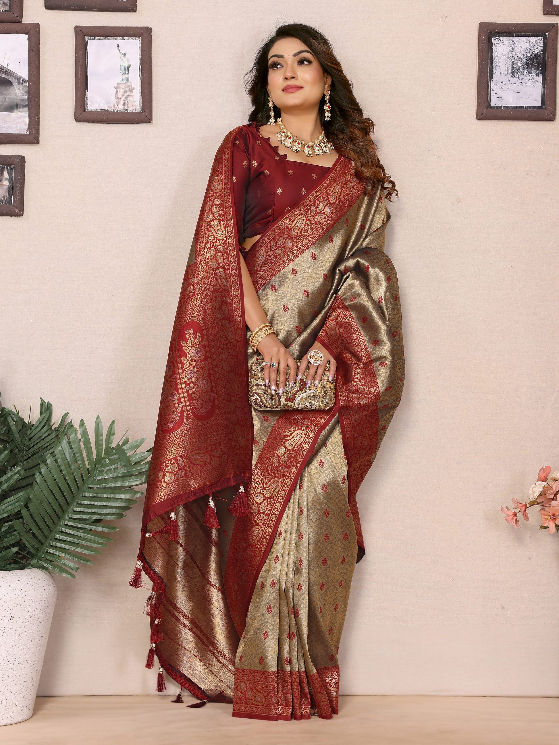साड़ी का कपड़ा:- हथकरघा टिशू सिल्क साड़ियाँ और कंट्रास्ट ज़री बुने हुए बॉर्डर के साथ