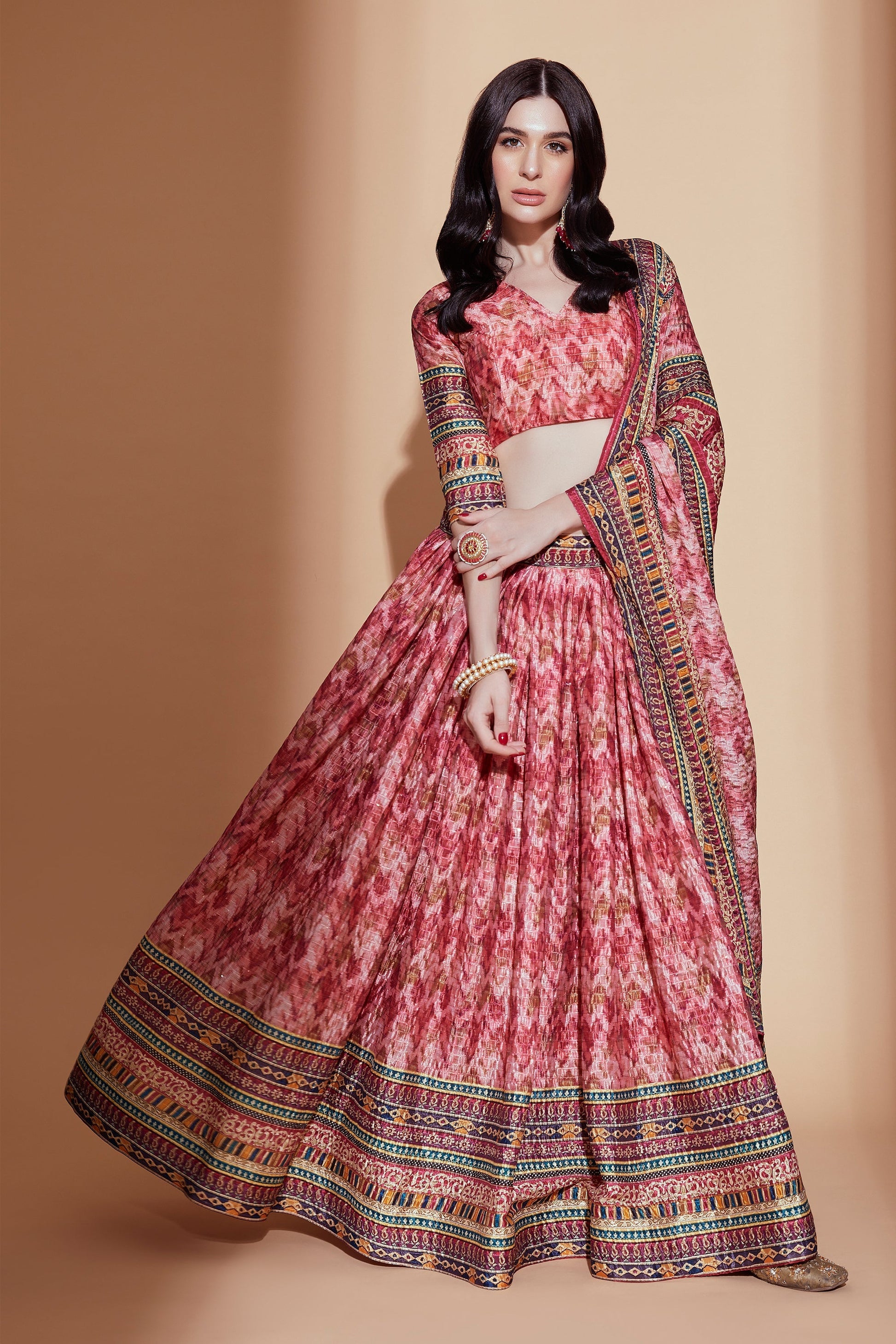 डिजिटल प्रिंट पीच चिनॉन फ़ैब्रिक संगीत वियर लहंगा चोली