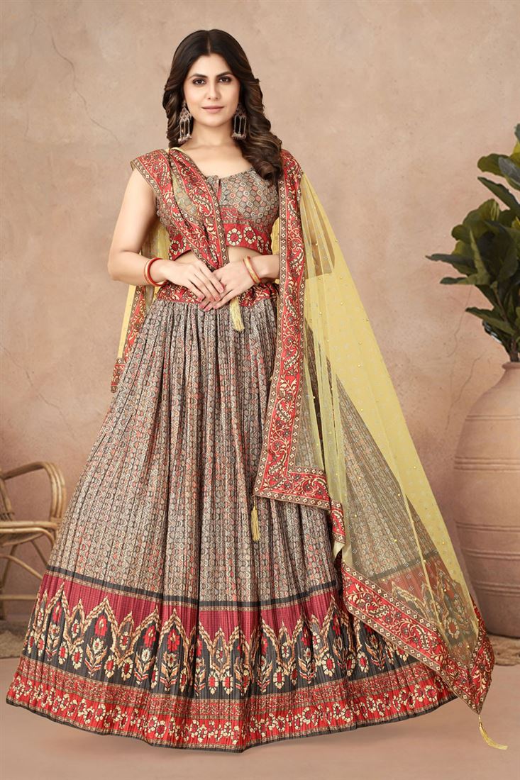 डिजिटल प्रिंटेड और क्रश्ड वर्क चिनॉन फैब्रिक लहंगा मल्टी कलर में