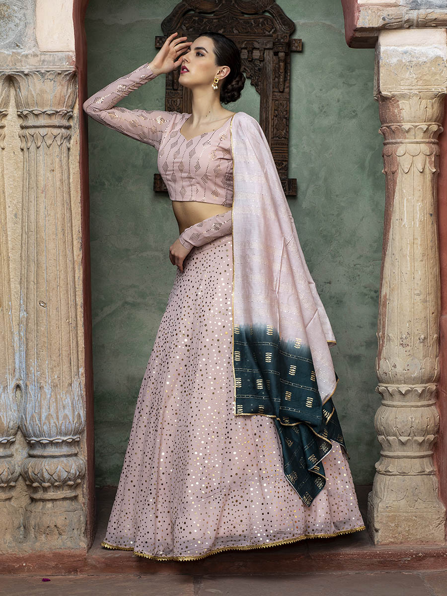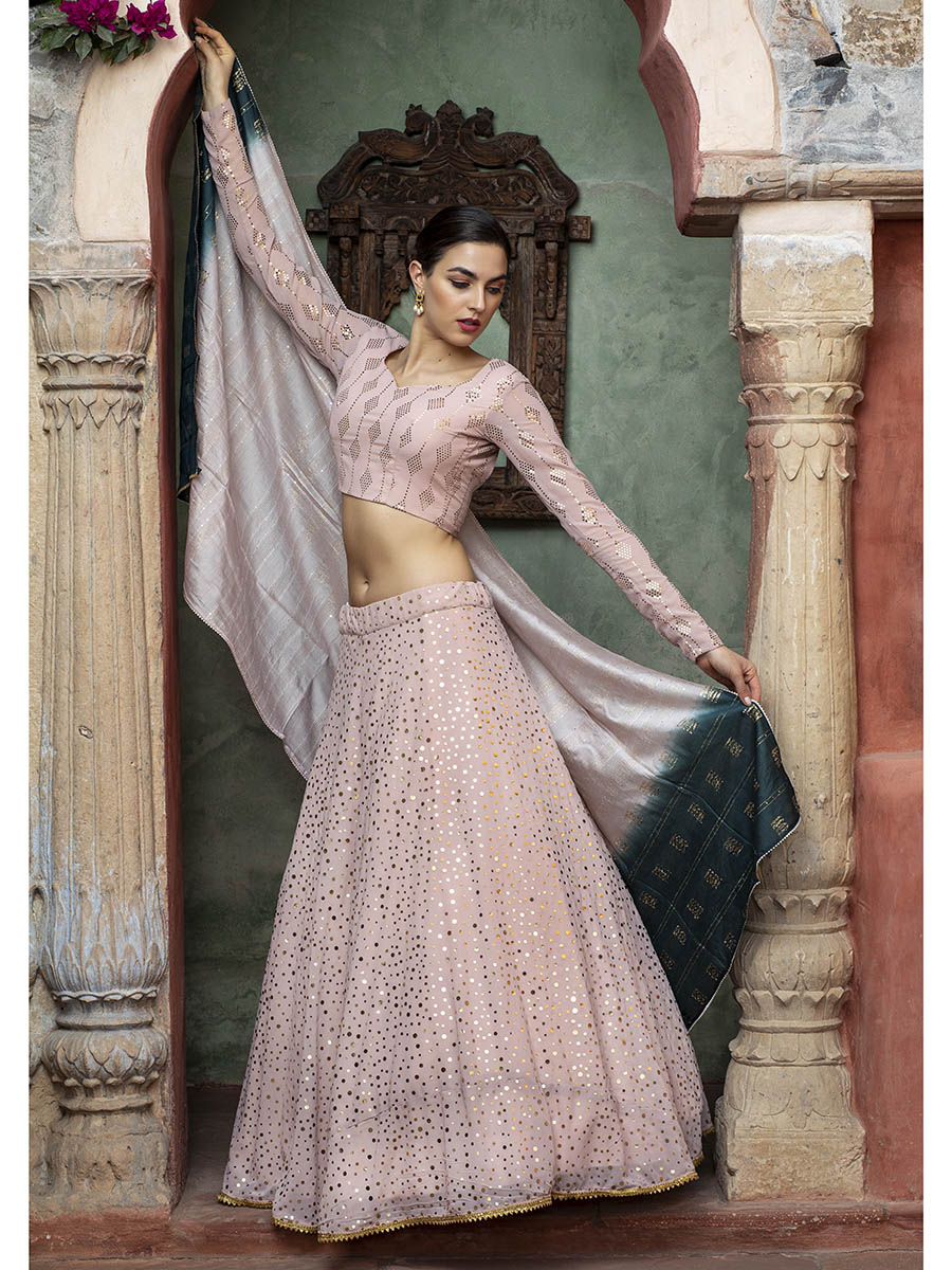 टेक्स्ट ब्लॉक डस्टी पिंक जॉर्जेट कढ़ाई वाला डिजाइनर लहंगा
