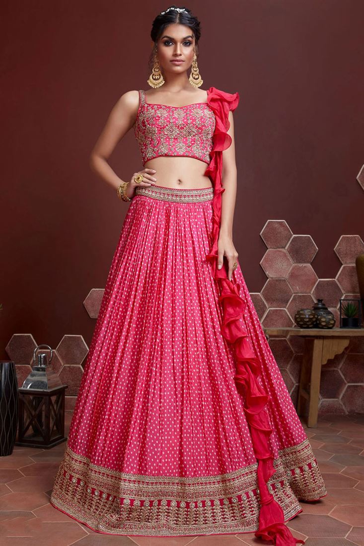 कढ़ाई के काम के साथ सुरुचिपूर्ण कला रेशम कपड़े सुंदर दुपट्टा के साथ गुलाबी रंग लेहेंगा