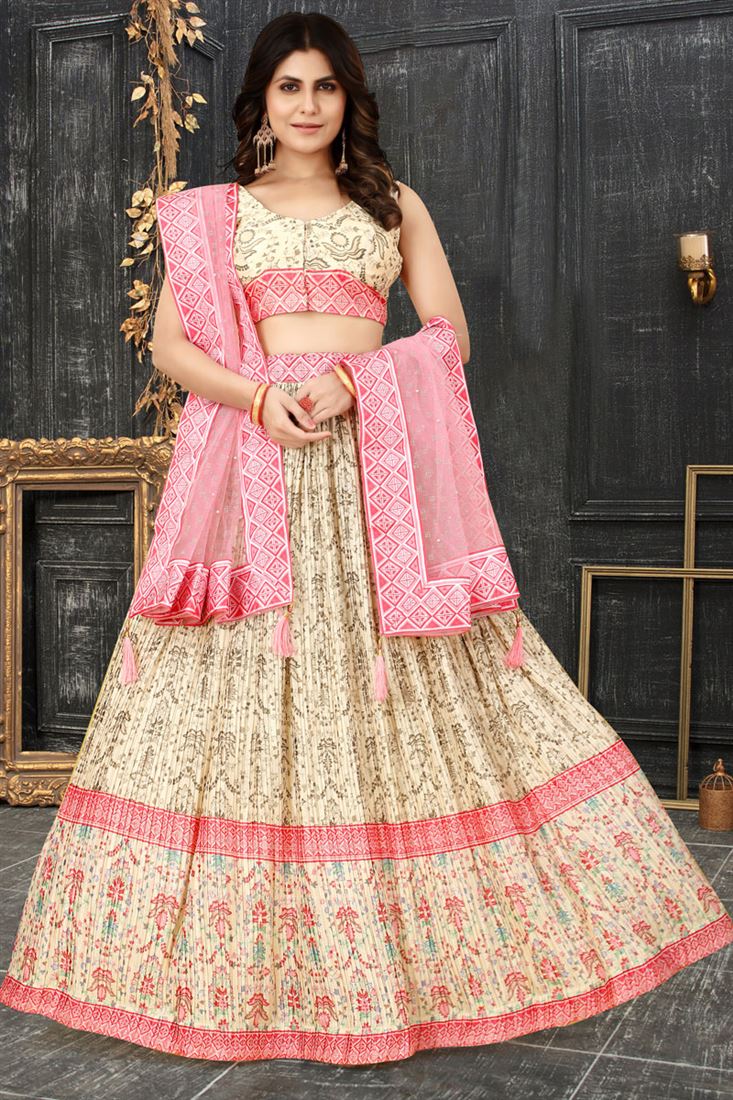 सुरुचिपूर्ण क्रीम रंग डिजिटल मुद्रित और कुचल काम चिनॉन फैब्रिक लेहेंगा