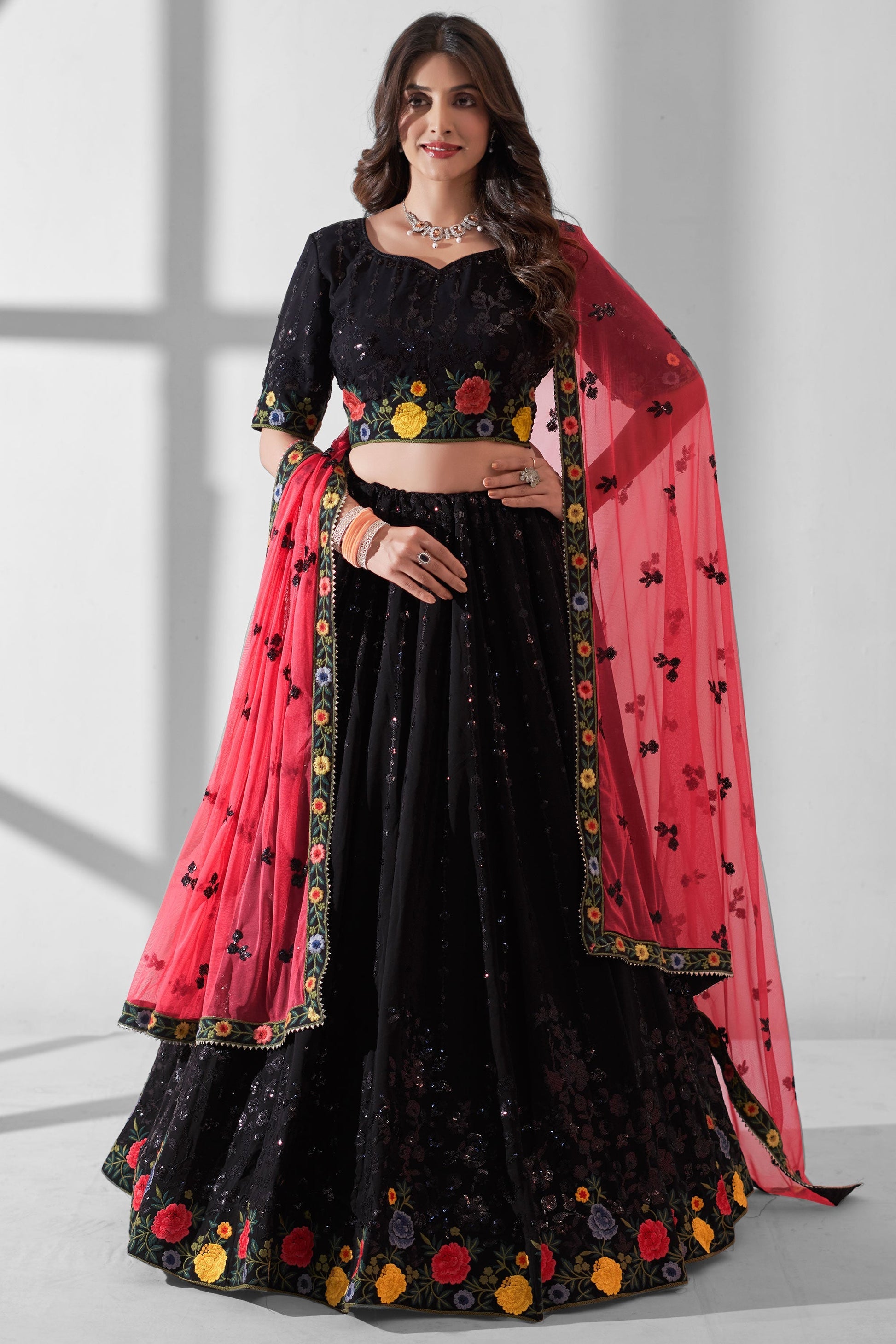 सुरुचिपूर्ण जॉर्जेट फैब्रिक सेक्विन वर्क काले रंग का लहंगा