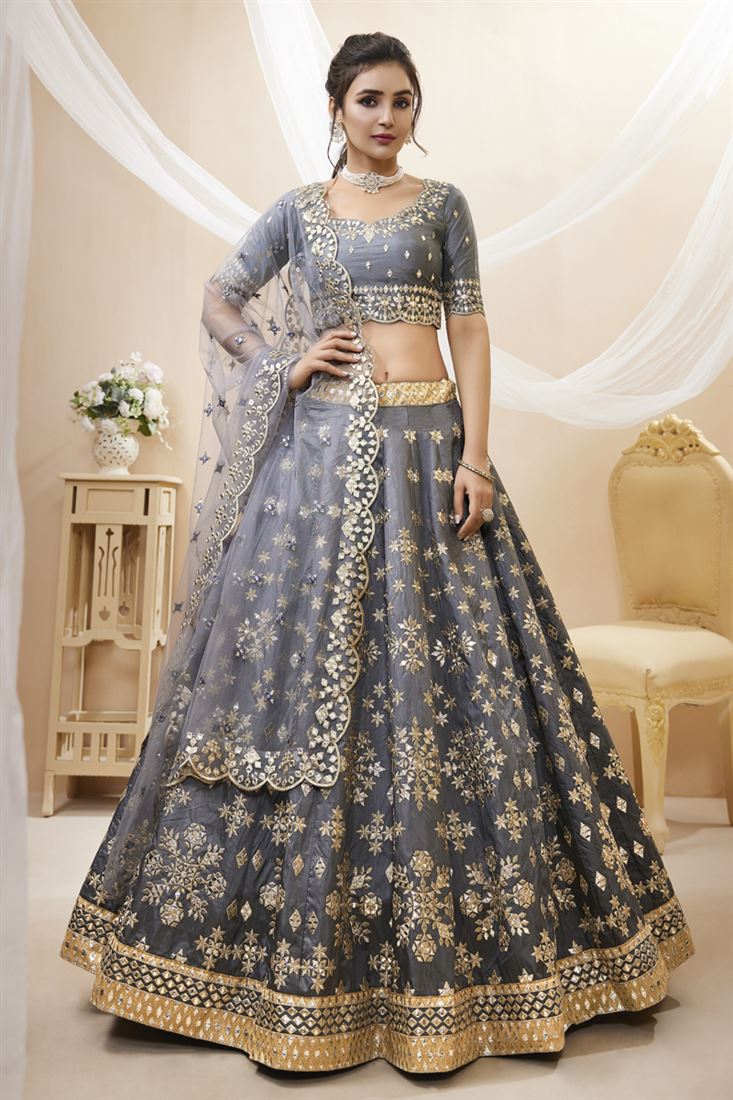 ग्रे कलर आर्ट सिल्क फैब्रिक लेहेंगा चोली पर अलंकृत कढ़ाई का काम
