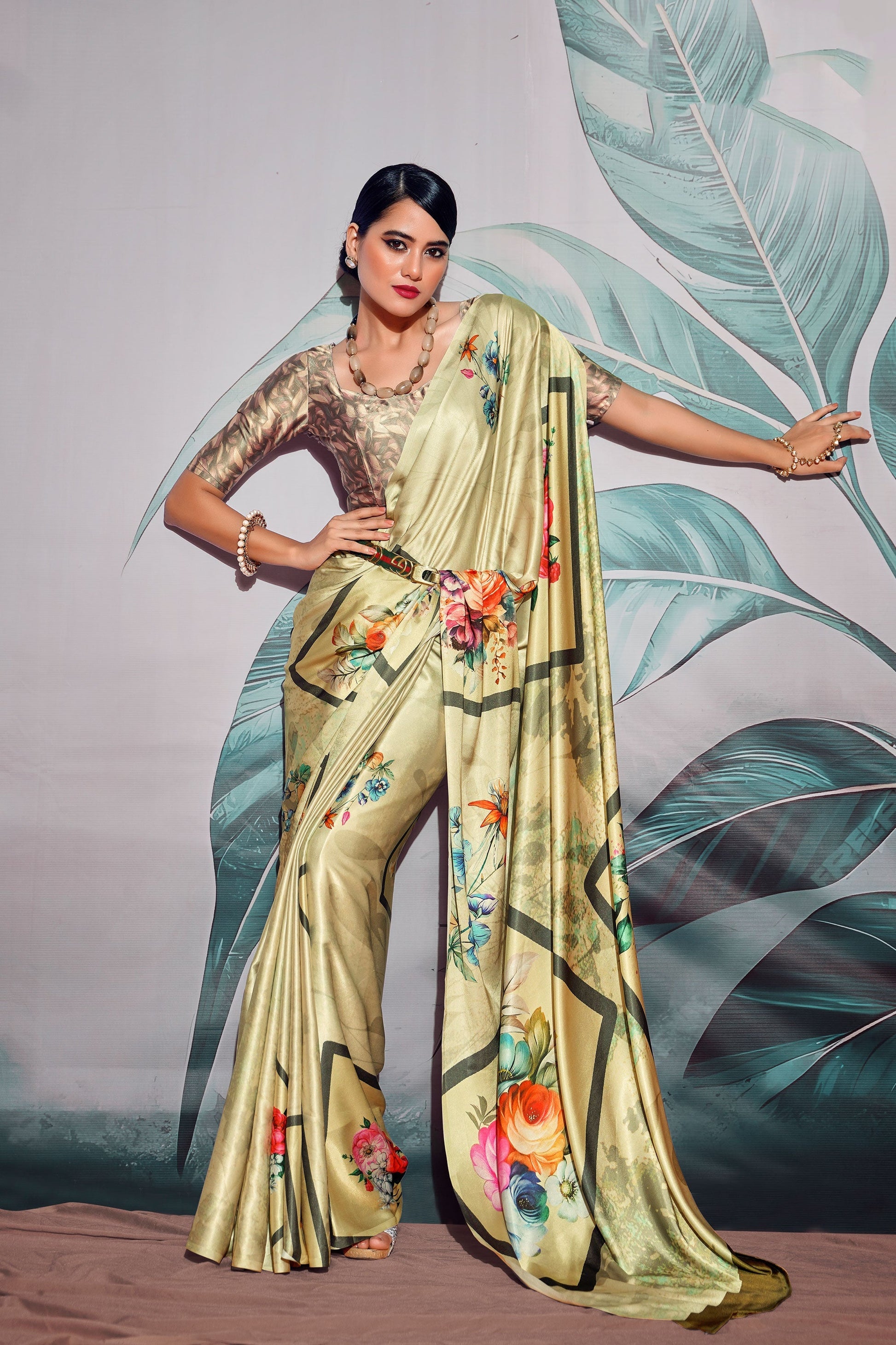 अलंकृत हरे रंग की डिजिटल प्रिंटेड साटन फैब्रिक साड़ी