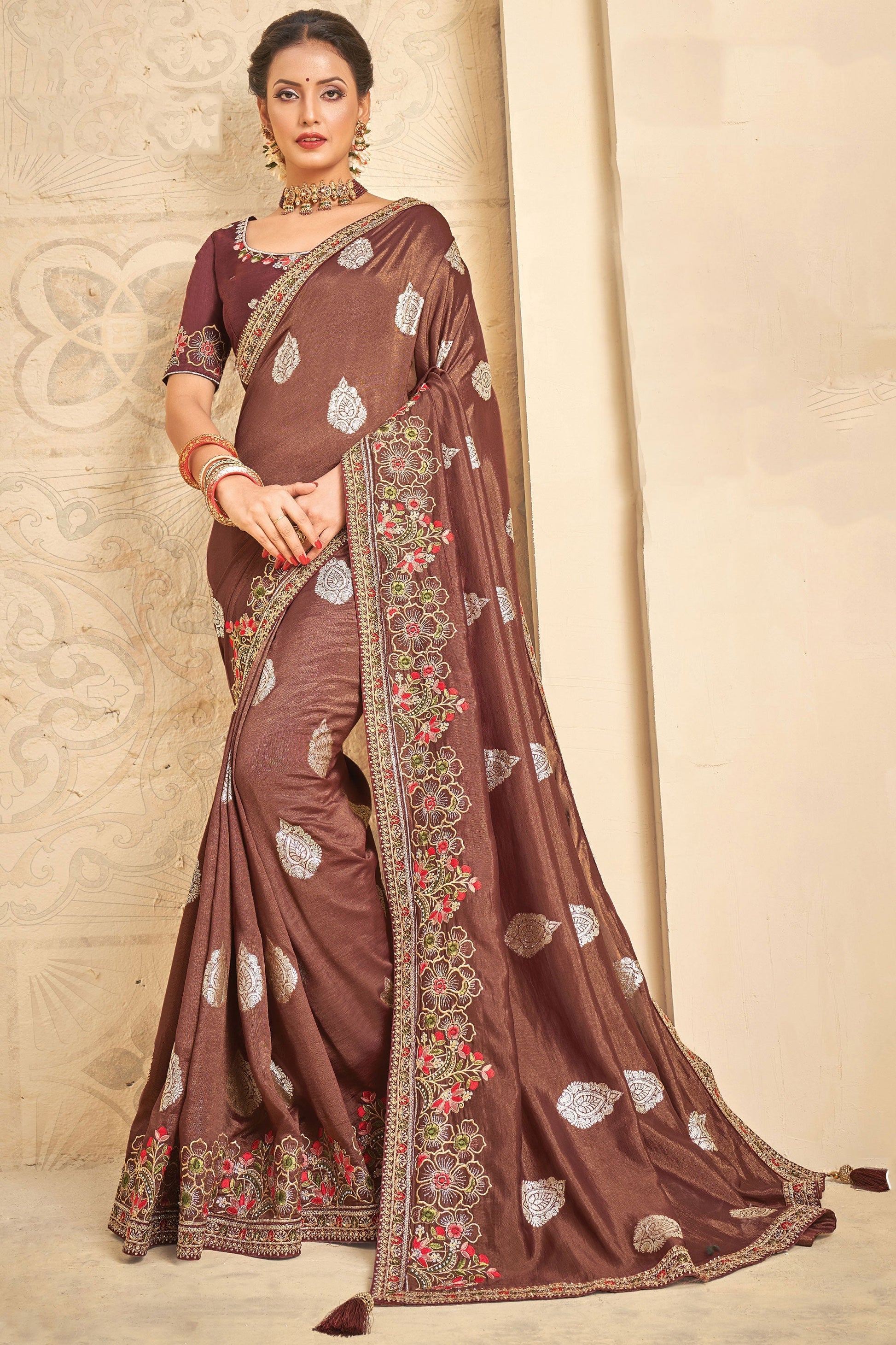 भूरे रंग में कढ़ाई कला रेशम कपड़े साड़ी