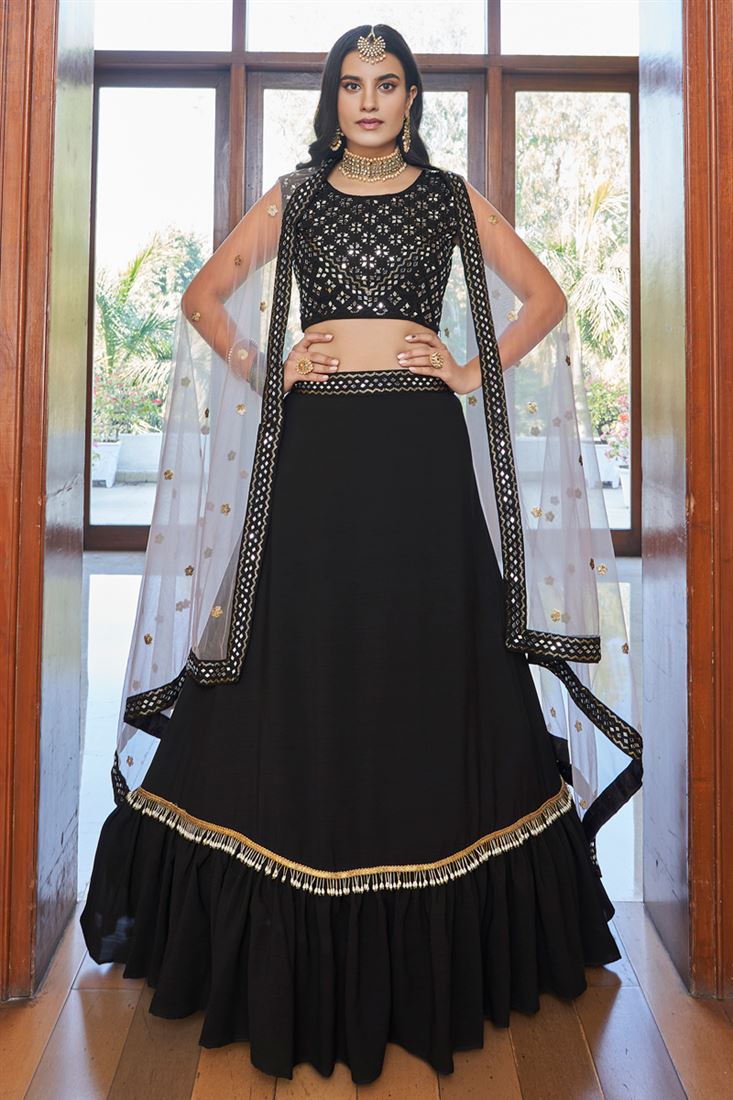आर्ट सिल्क फैब्रिक में कढ़ाई किया हुआ काले रंग का अलंकृत लहंगा
