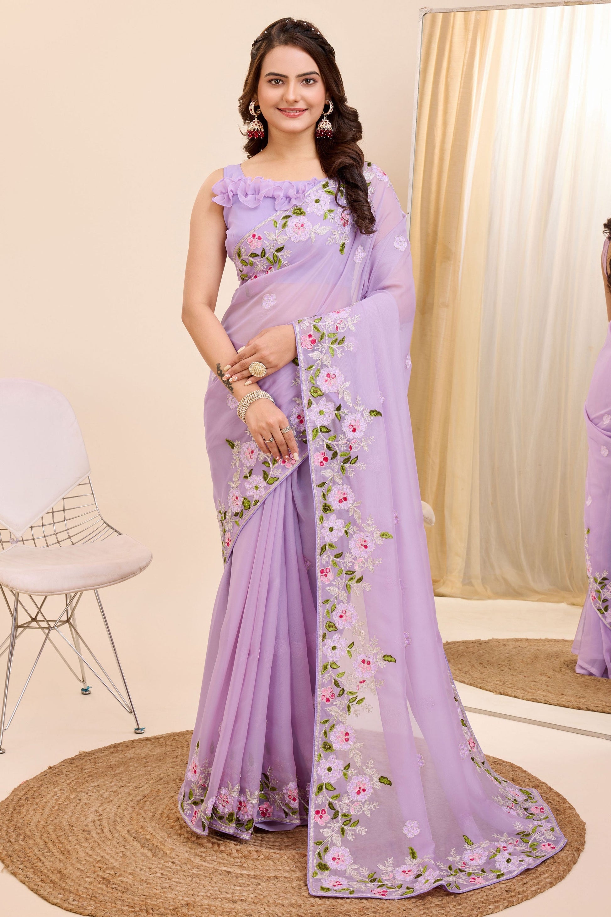 कढ़ाई का काम लैवेंडर रंग में उत्सव पहनने कला सिल्क साड़ी