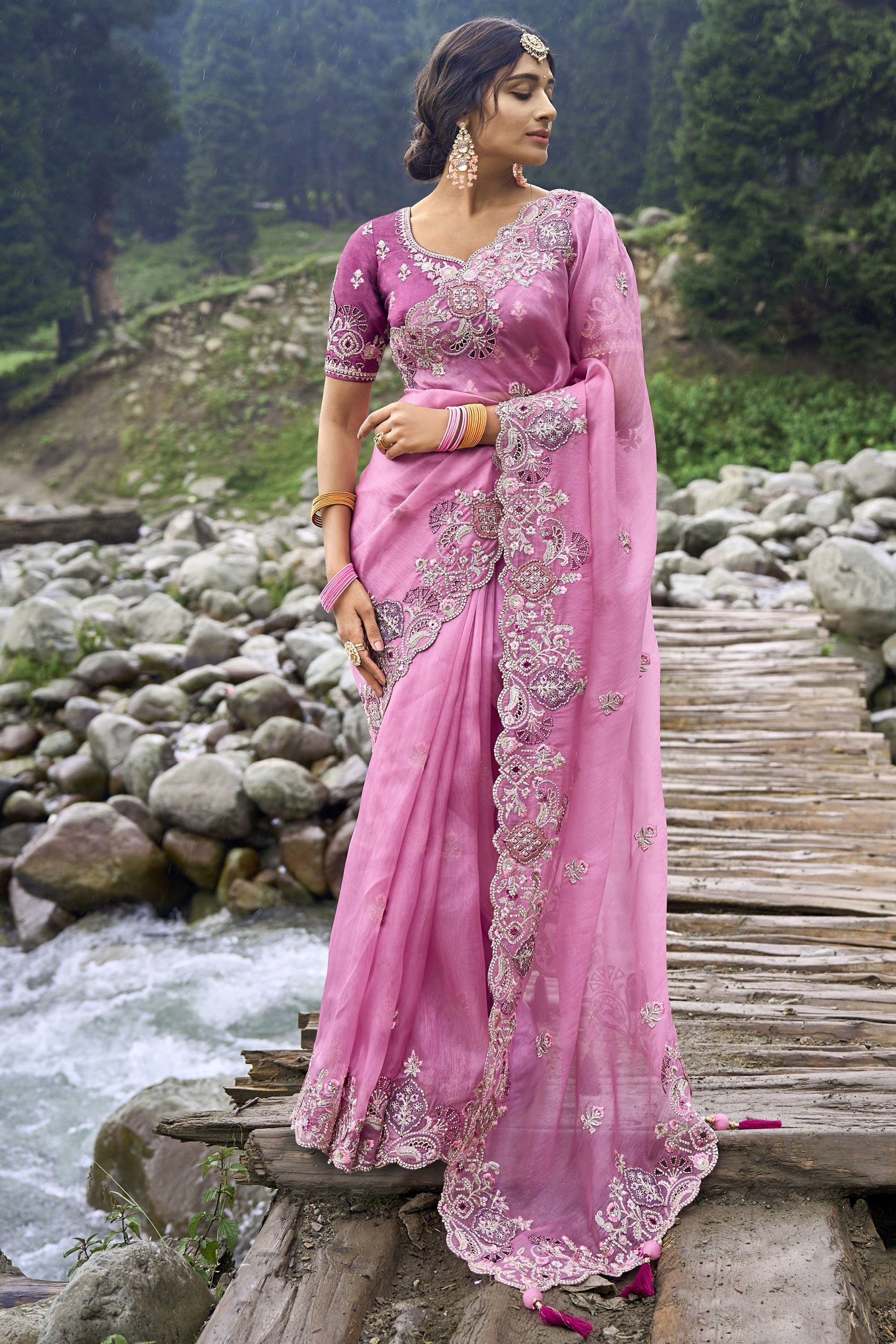 कढ़ाई का काम गुलाबी रंग फैंसी रेशम कपड़े सुंदर साड़ी