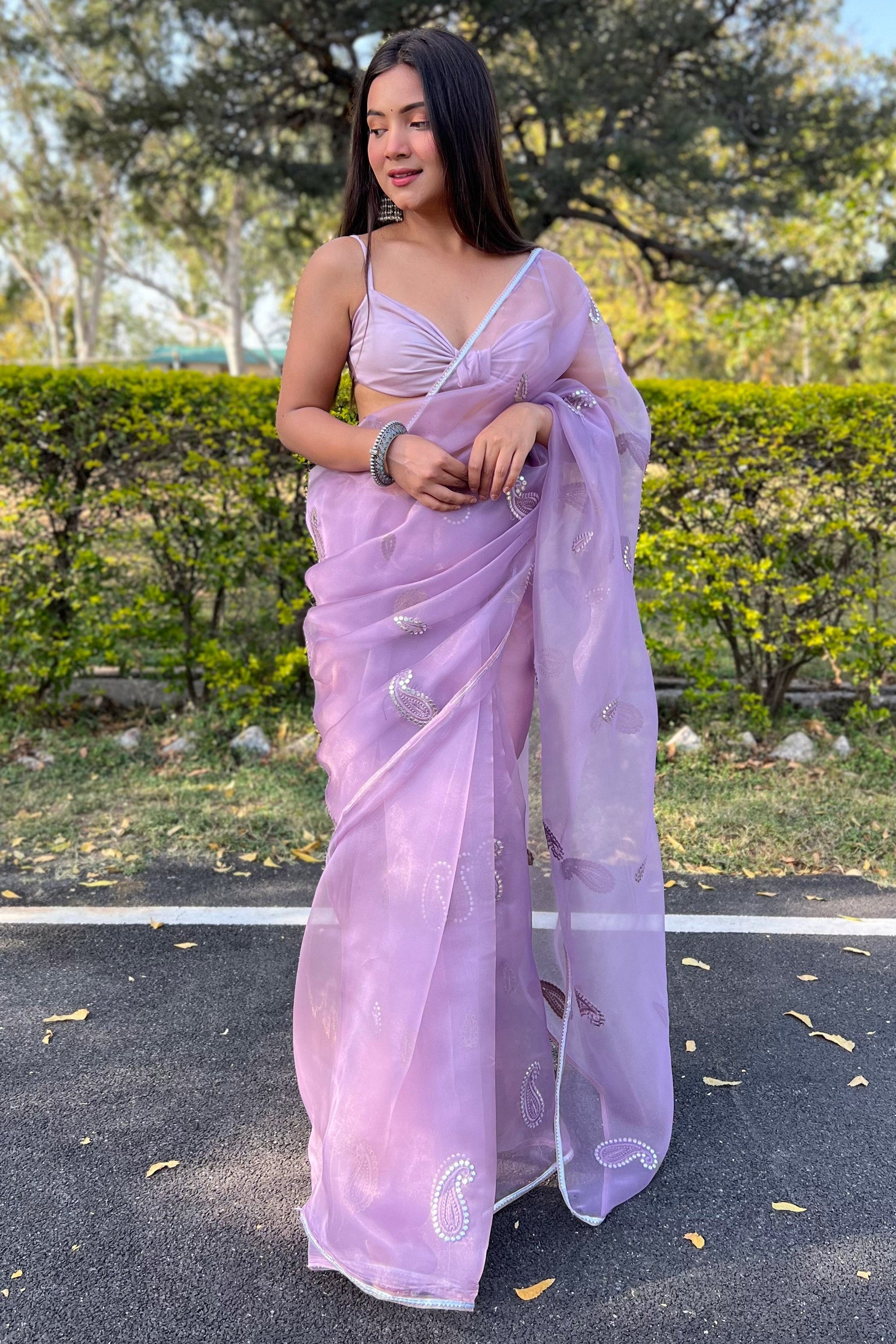 ऑर्गेंजा फैब्रिक में कढ़ाई वर्क वाली बैंगनी साड़ी