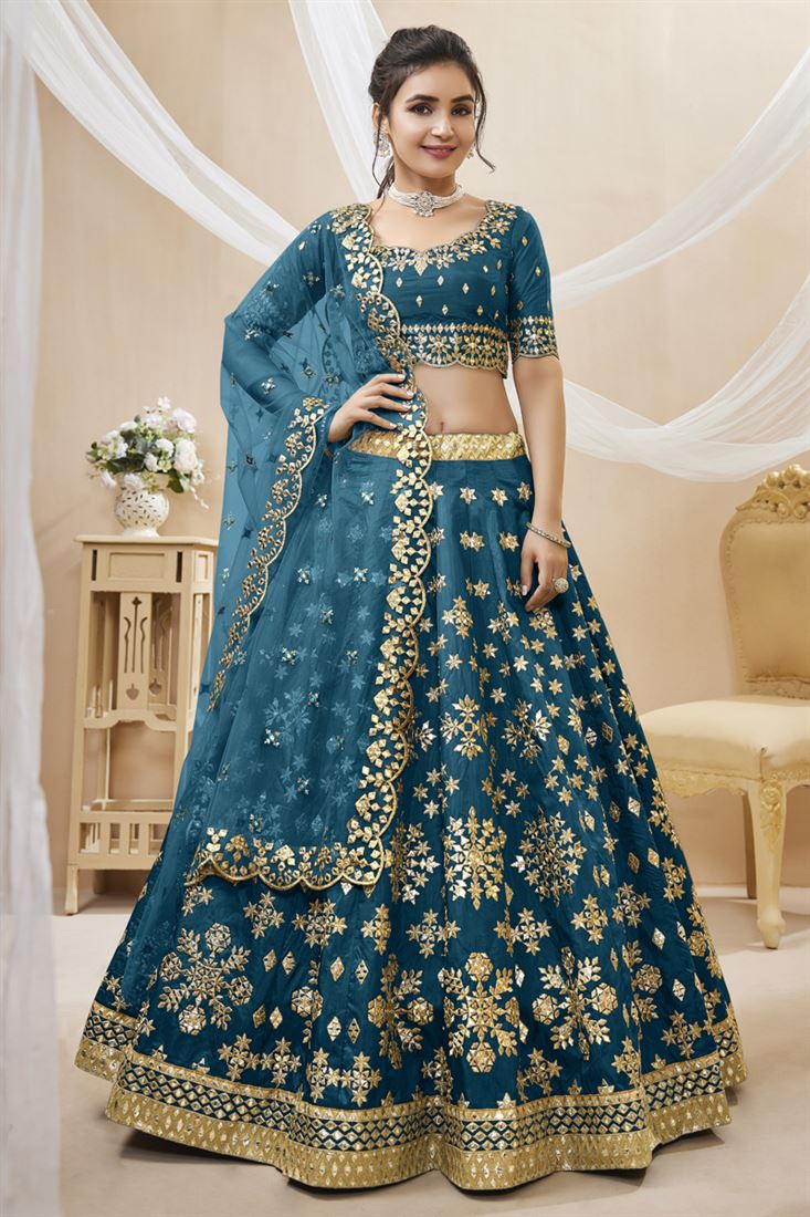 आकर्षक नीले रंग की आर्ट सिल्क फैब्रिक कढ़ाई वर्क लहंगा चोली