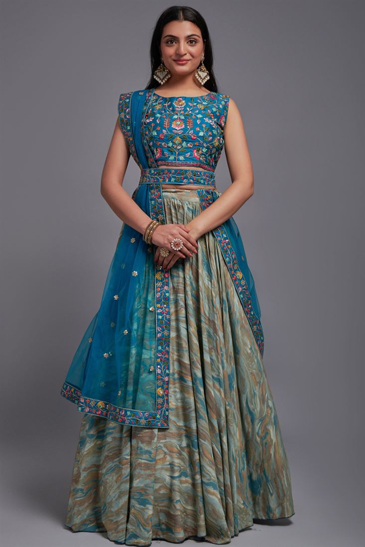 टेक्स्ट ब्लॉक आकर्षक सियान रंग कला रेशम कपड़े कढ़ाई काम शादी पहनने लेहेंगा चोली