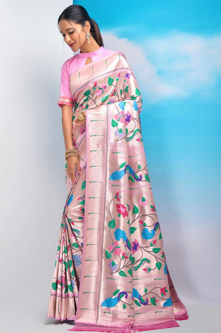 बुनाई के काम के साथ आकर्षक गुलाबी रंग पैठणी रेशम कपड़े की साड़ी