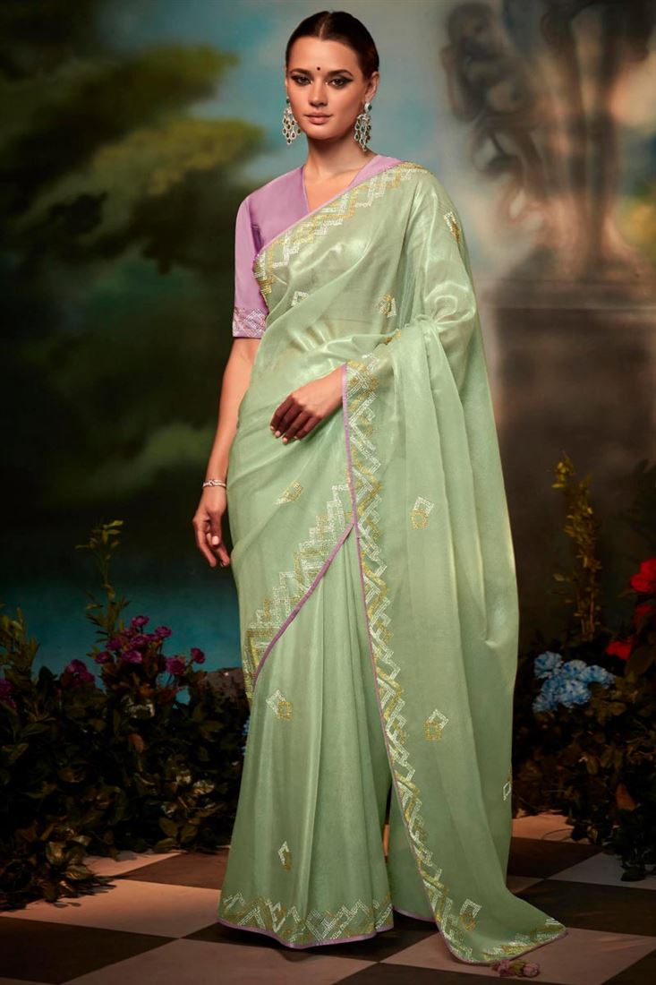 यूजेनिया बेलौसोवा समुद्री हरे रंग की कला रेशम कपड़े में आविष्कारशील साड़ी