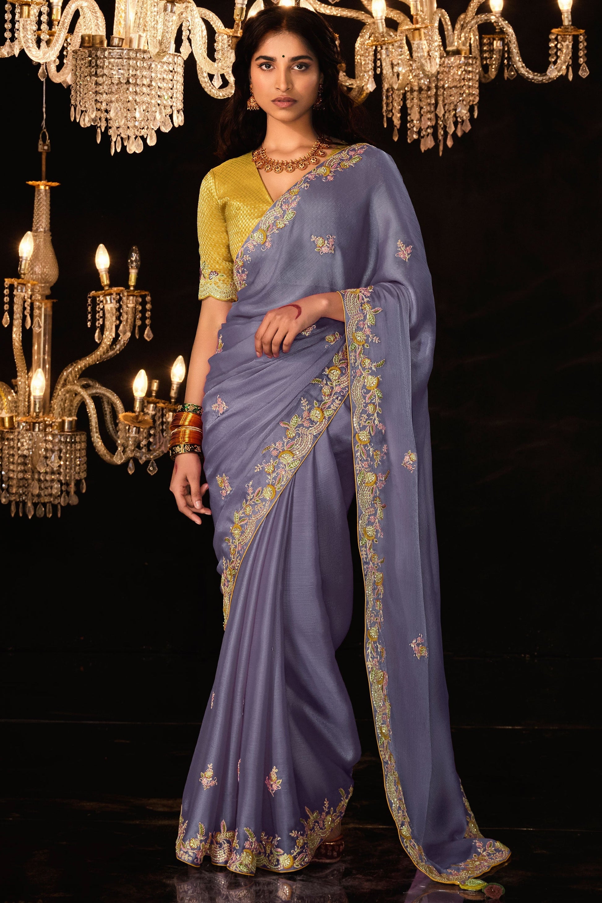 कढ़ाई के काम के साथ उत्कृष्ट फैंसी फैब्रिक लैवेंडर रंग की साड़ी