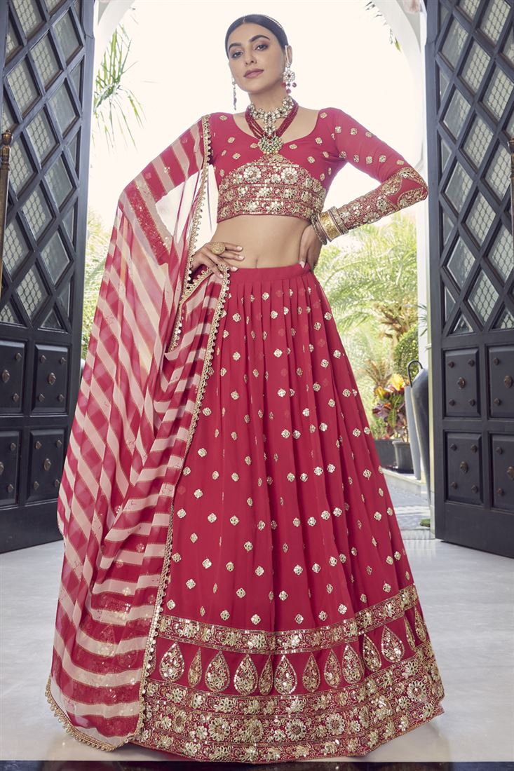लाल रंग के जॉर्जेट फैब्रिक में डिज़ाइनर लहंगे पर विशेष रचनात्मक कढ़ाई का काम