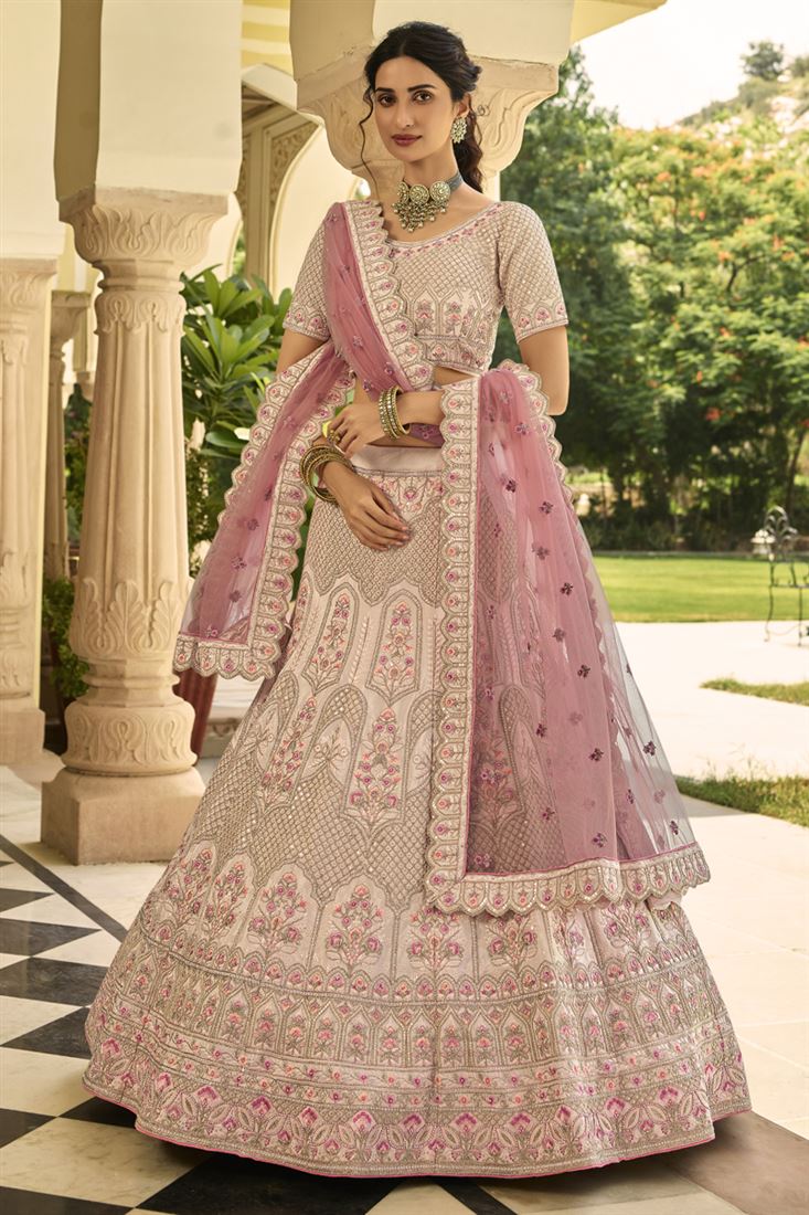 गुलाबी रंग के क्रेप फैब्रिक में विशेष कढ़ाई वाला वेडिंग वियर लहंगा चोली