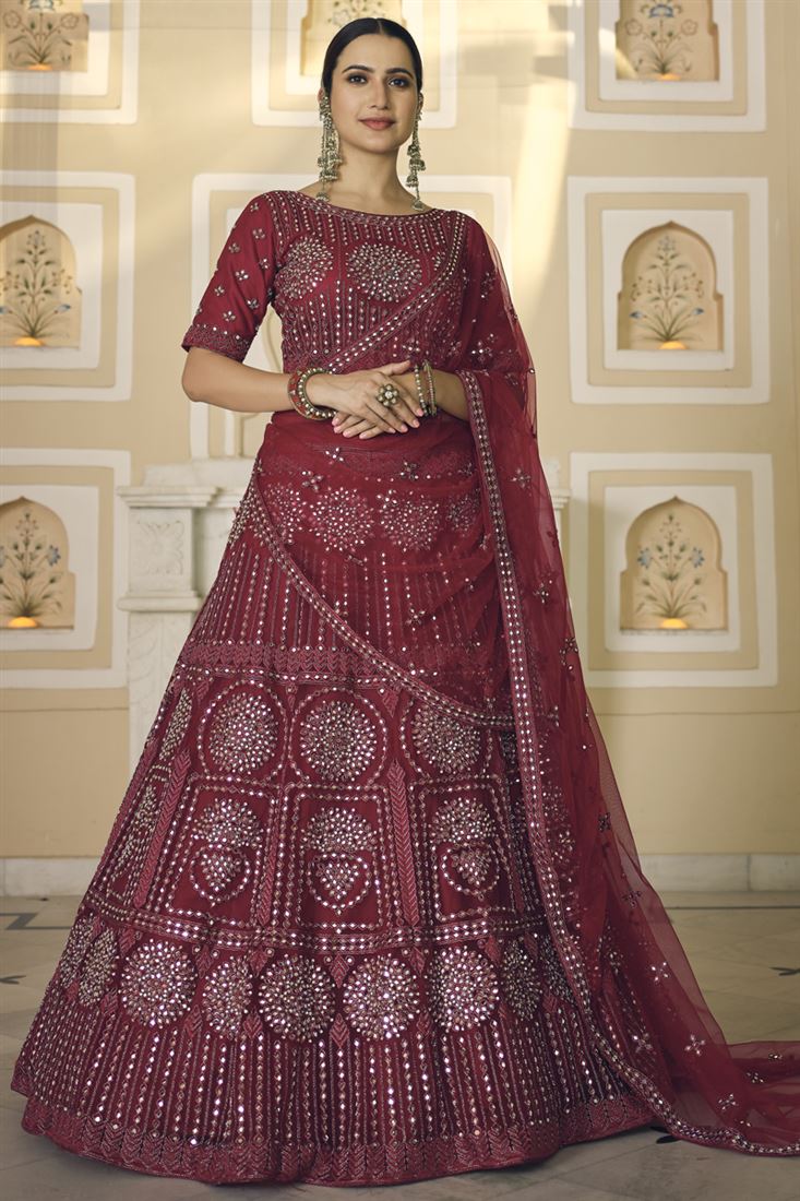 टेक्स्ट ब्लॉक एक्सक्लूसिव बेहतरीन नेट फैब्रिक मैरून रंग सुंदर कढ़ाई वर्क लहंगा