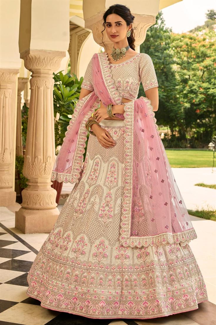 विशेष समारोह पहनने डिजाइनर बेज रंग लेहेंगा चोली क्रेप फैब्रिक में