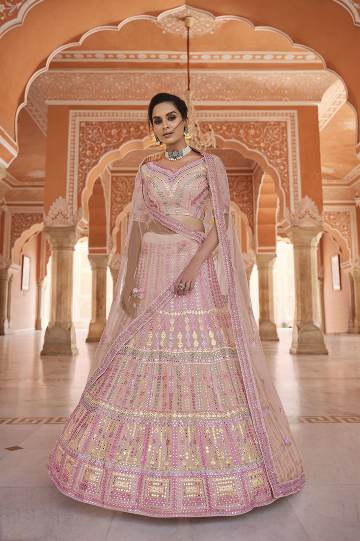 ऑर्गेंजा फैब्रिक में विशेष सुंदर गुलाबी कढ़ाई वाला संगीत वियर लहंगा चोली