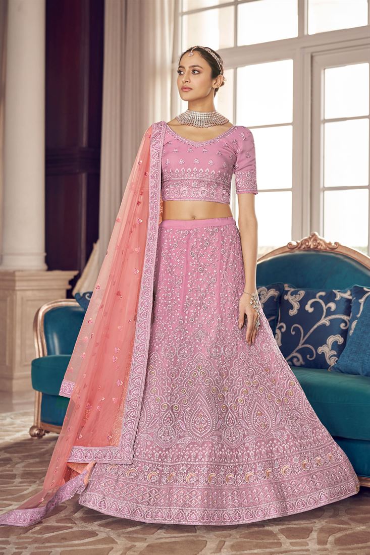 एक्सक्लूसिव ऑर्गेंजा फैब्रिक पिंक कलर का बेहतरीन लहंगा नेट दुपट्टे के साथ