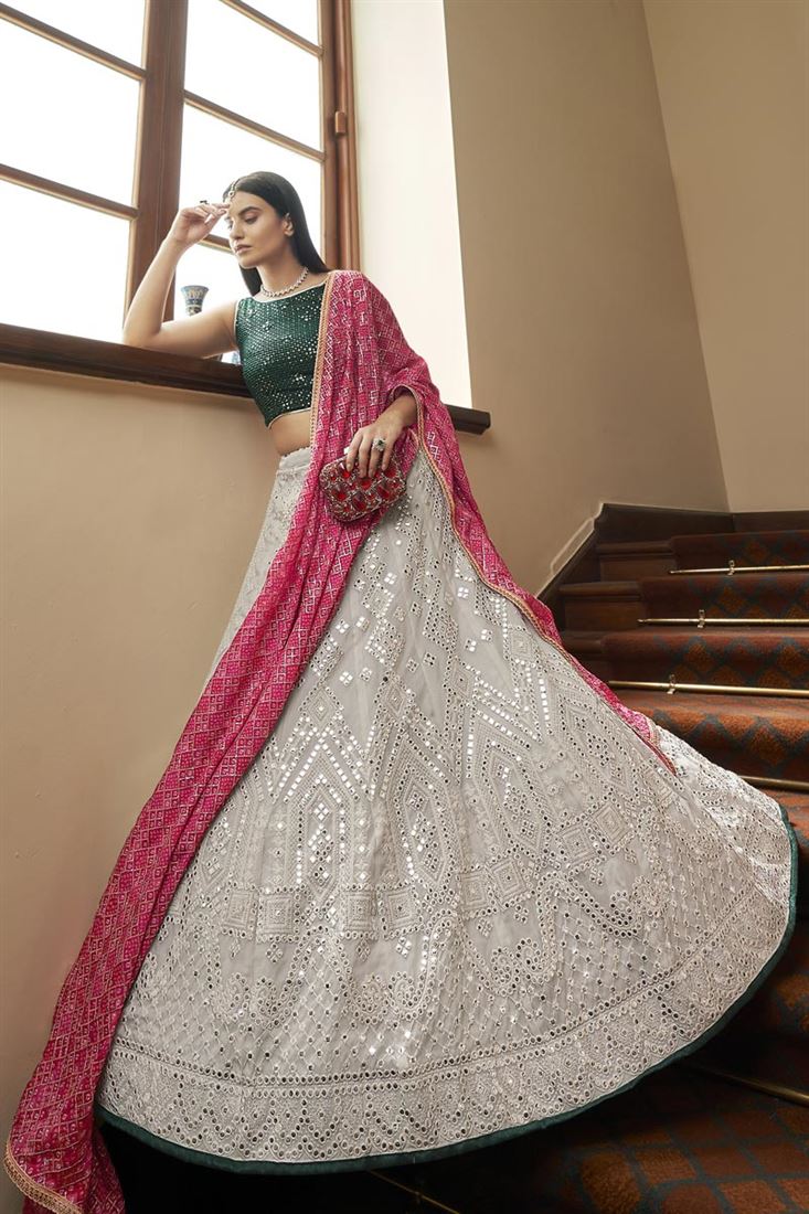 एक्सक्लूसिव संगीत वियर ठाठ ऑर्गेना फैब्रिक कढ़ाई वाला लहंगा ऑफ व्हाइट कलर में