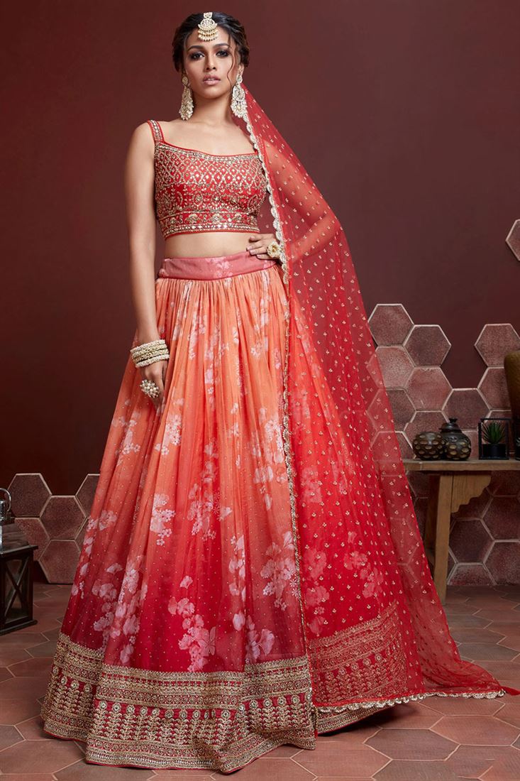 एक्सक्लूसिव संगीत वियर डिजिटल प्रिंटेड वर्क ऑरेंज कलर डिज़ाइनर लहंगा चोली