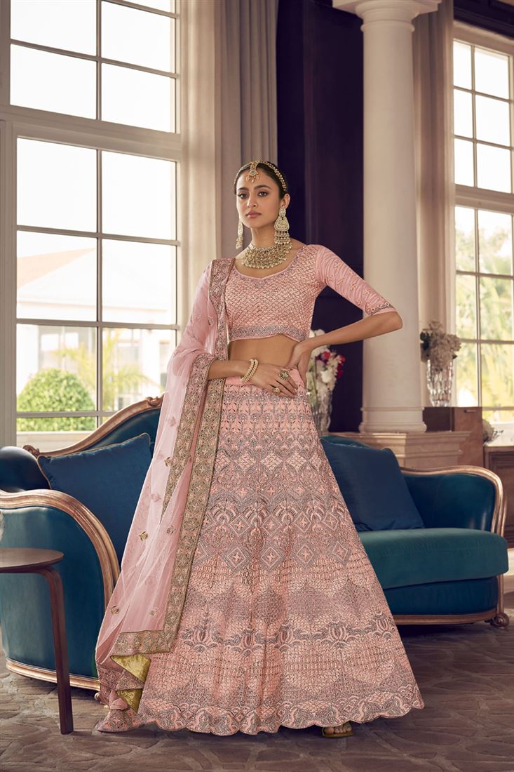 एक्सक्लूसिव संगीत वियर पीच कलर का एम्ब्रॉयडरी वर्क वाला लहंगा क्रेप फैब्रिक में