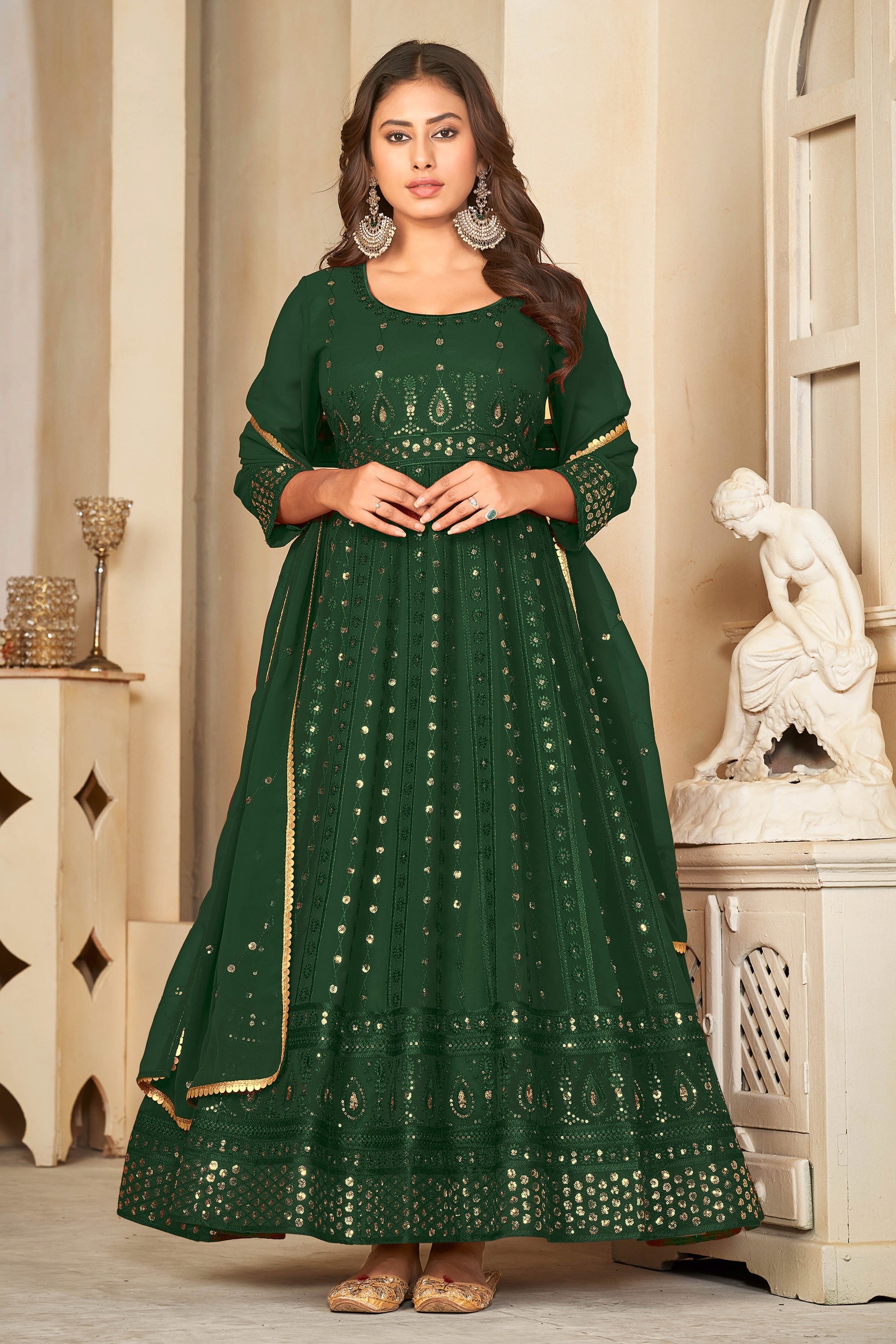 आकर्षक गहरे हरे रंग का जॉर्जेट फैब्रिक सेक्विन कढ़ाई वाला अनारकली सूट