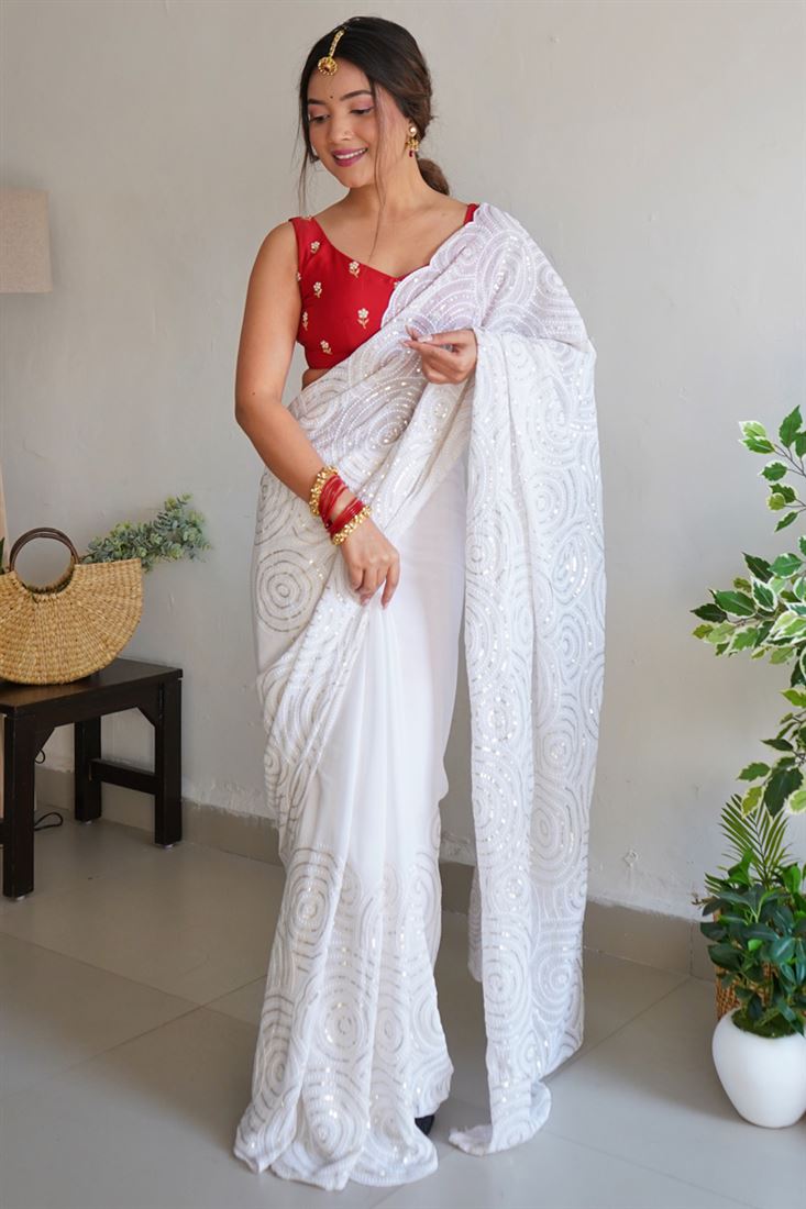 आकर्षक सफ़ेद सेक्विन वर्क जॉर्जेट साड़ी ब्लाउज़ के साथ