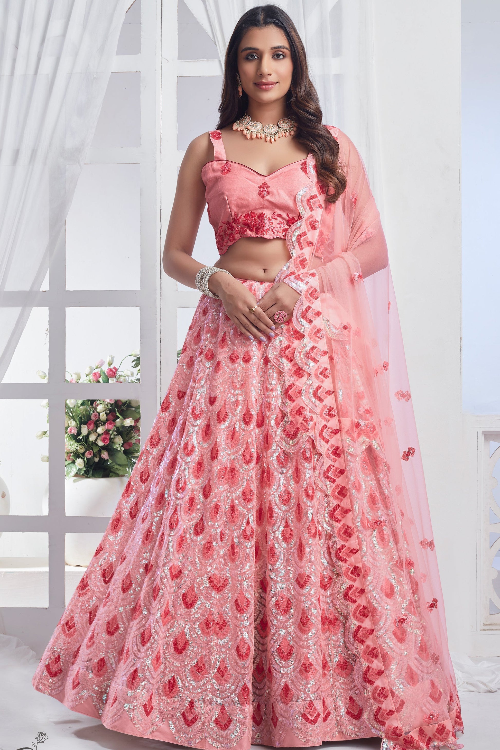 फैशनेबल पीच कलर सेक्विन वर्क नेट फैब्रिक लहंगा