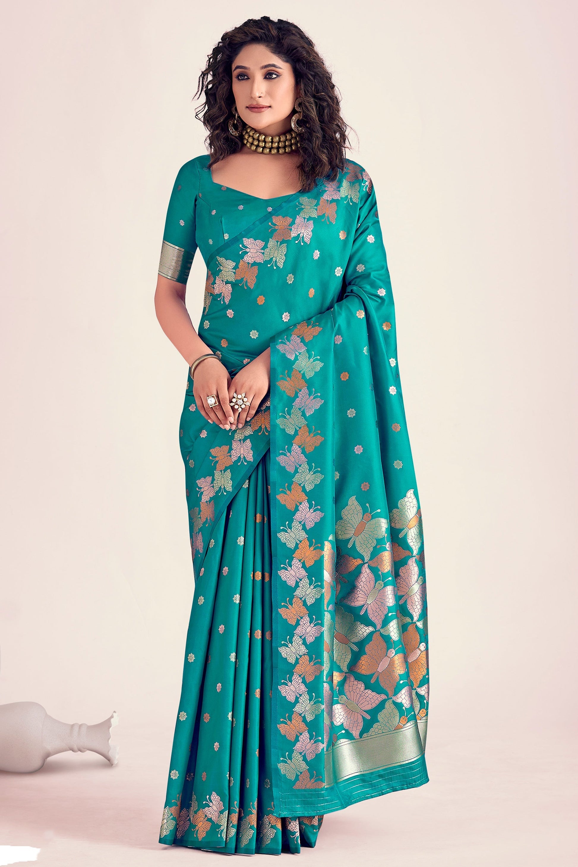 फैशनेबल समुद्री हरा रंग मुद्रित बनारसी शैली रेशम साड़ी