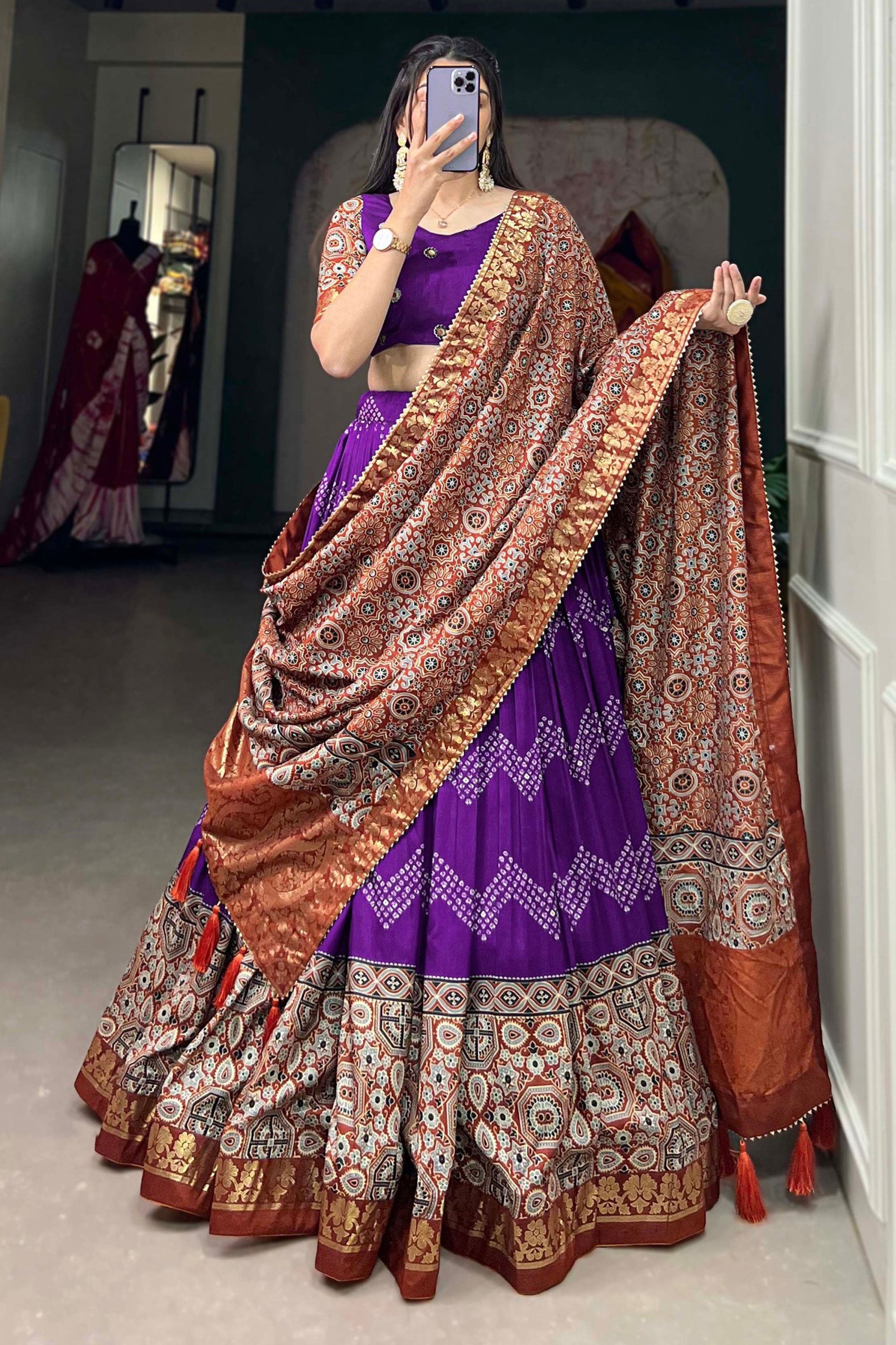 टेक्स्ट ब्लॉक त्यौहार पर पहनने के लिए आर्ट सिल्क फैब्रिक में बैंगनी रंग का शानदार रेडीमेड लहंगा