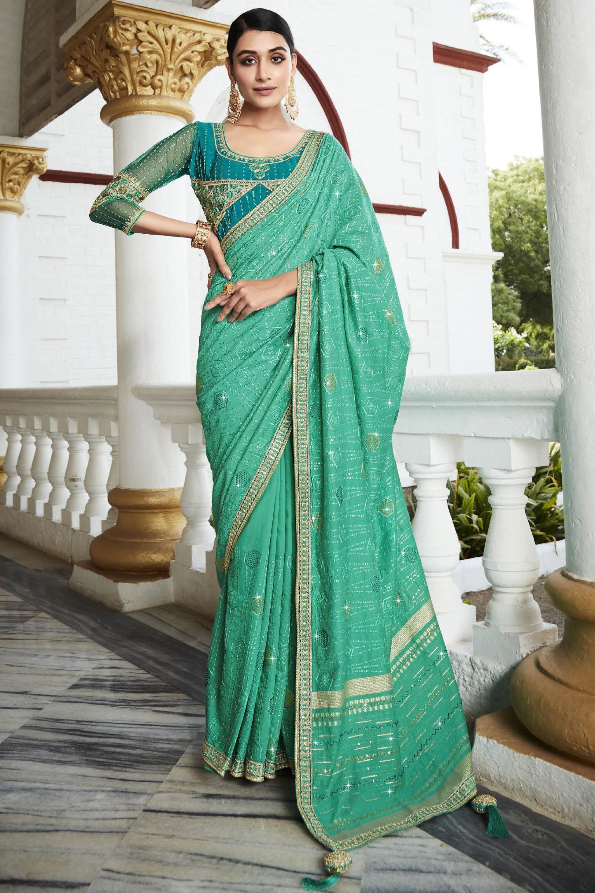 कढ़ाईदार डिजाइनर ब्लाउज के साथ उत्सव पहनने समुद्री हरे रंग रेशम कपड़े साड़ी