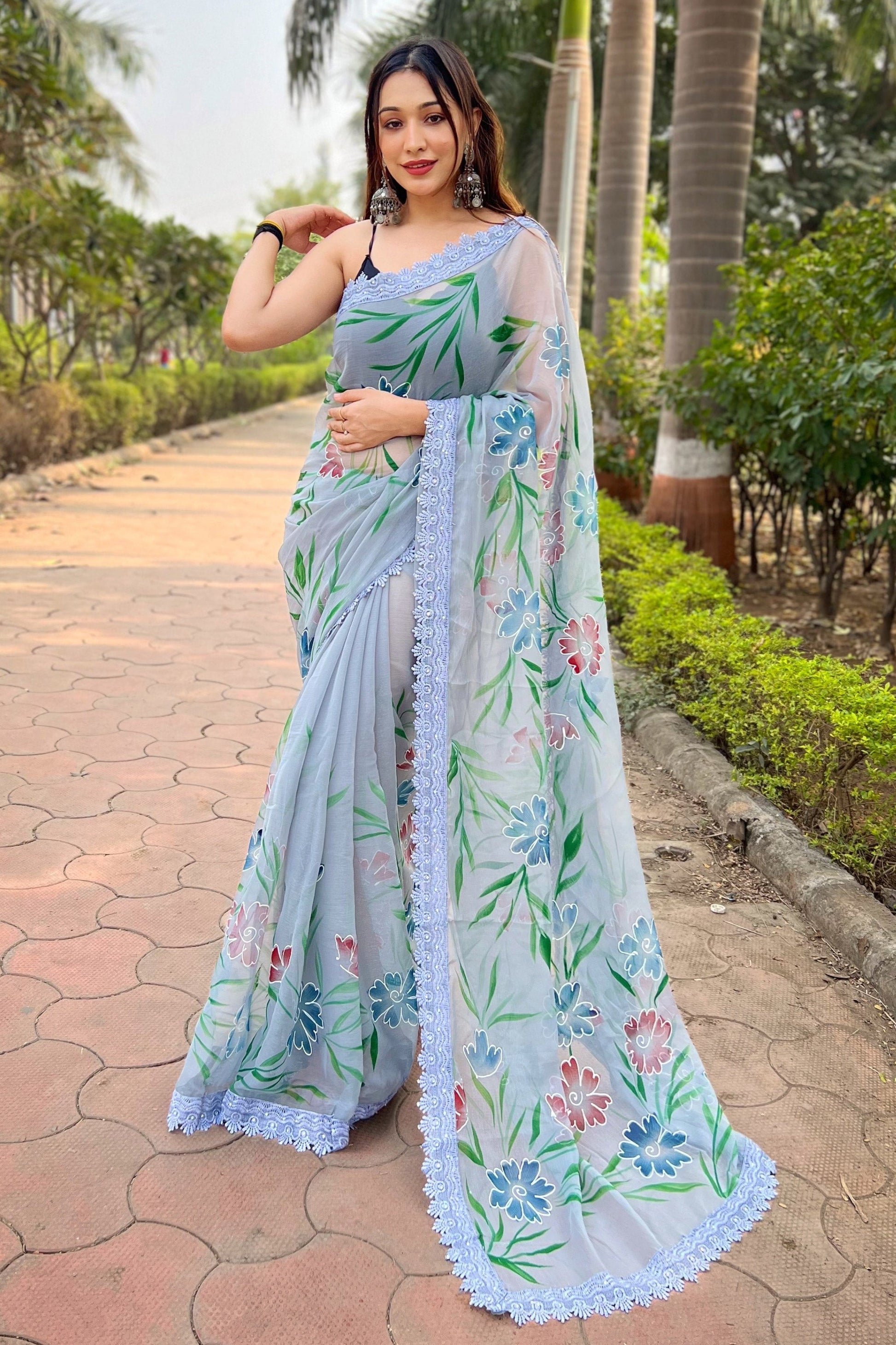 ग्रे रंग में फ्लोरल प्रिंट फैंसी फैब्रिक कैज़ुअल साड़ी