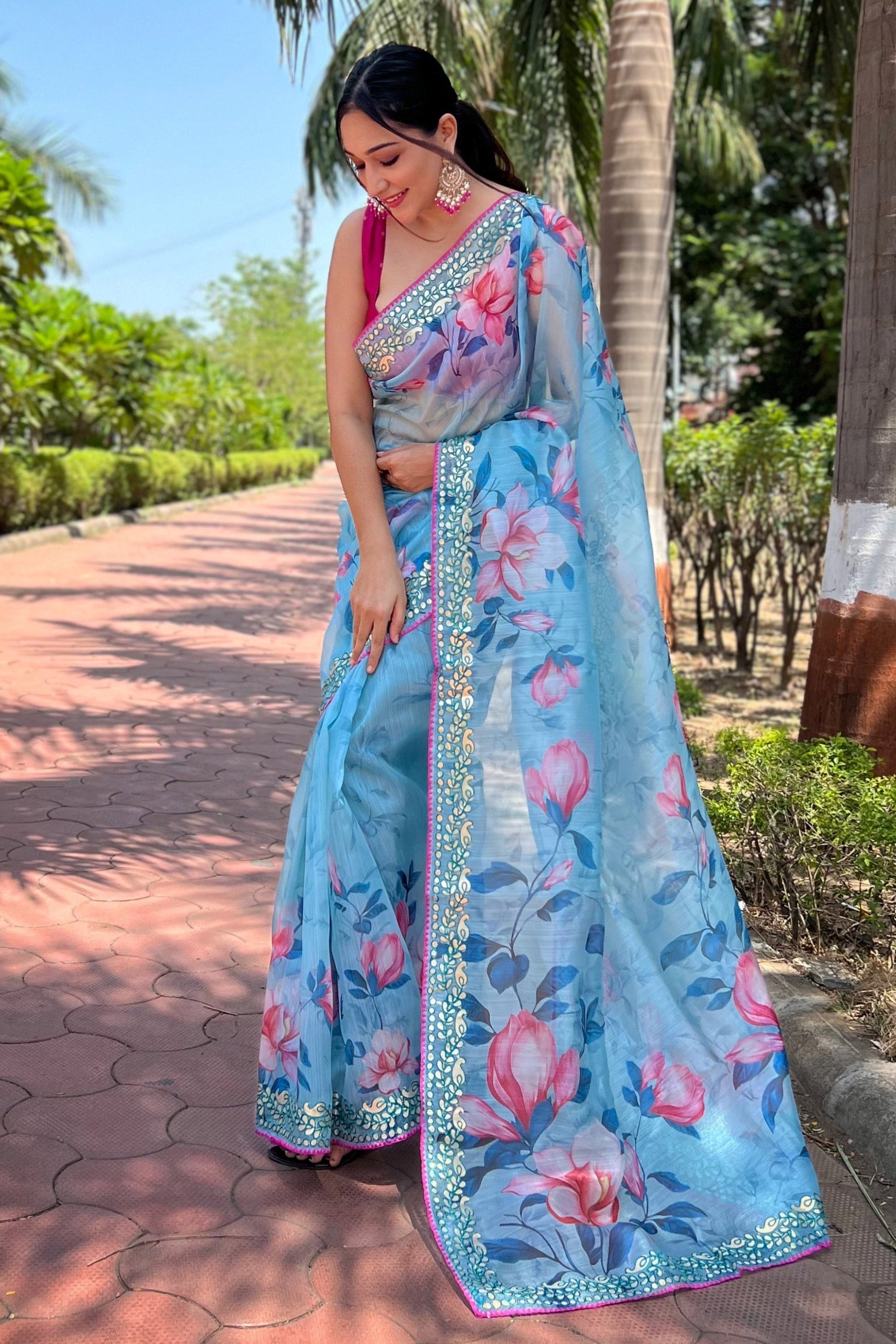 फ्लोरल प्रिंट स्काई ब्लू कलर कैज़ुअल ऑर्गेना फ़ैब्रिक साड़ी ब्लाउज़ के साथ