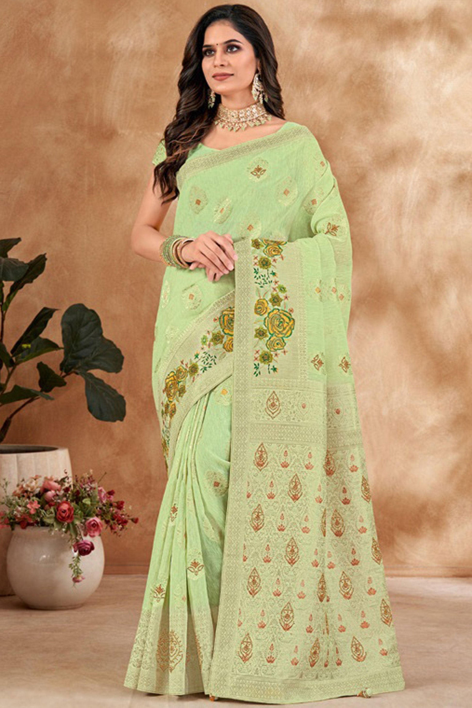 समुद्री हरे रंग में अद्भुत कोरा सिल्क फैब्रिक साड़ी पर फ़ॉइल प्रिंटेड वर्क