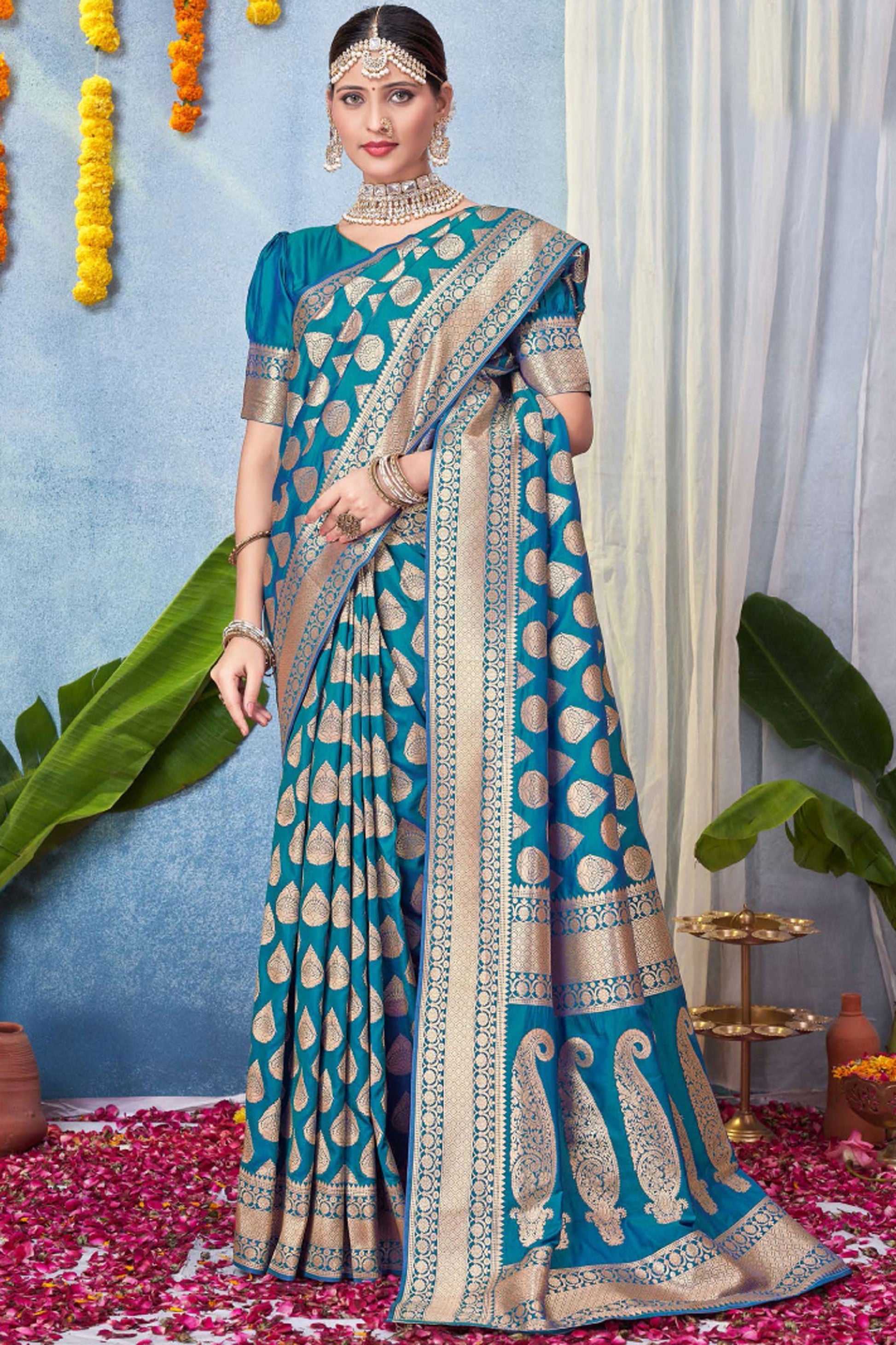 टेक्स्ट ब्लॉक समारोह में पहनने के लिए टील रंग में आकर्षक आर्ट सिल्क फैब्रिक साड़ी