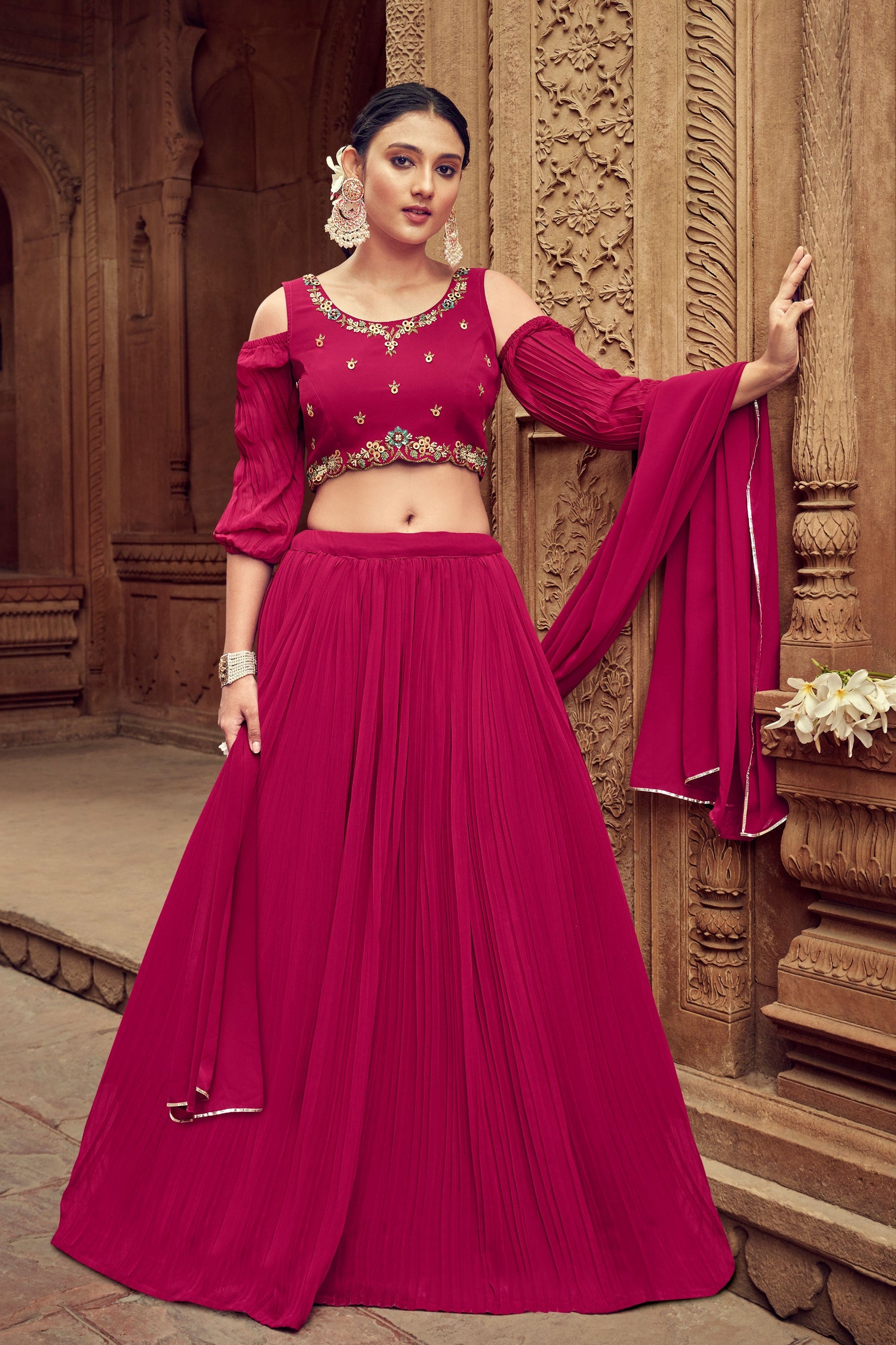 जॉर्जेट फ़ैब्रिक रानी रंग एलिगेंट फंक्शन स्टाइल रेडीमेड लहंगा