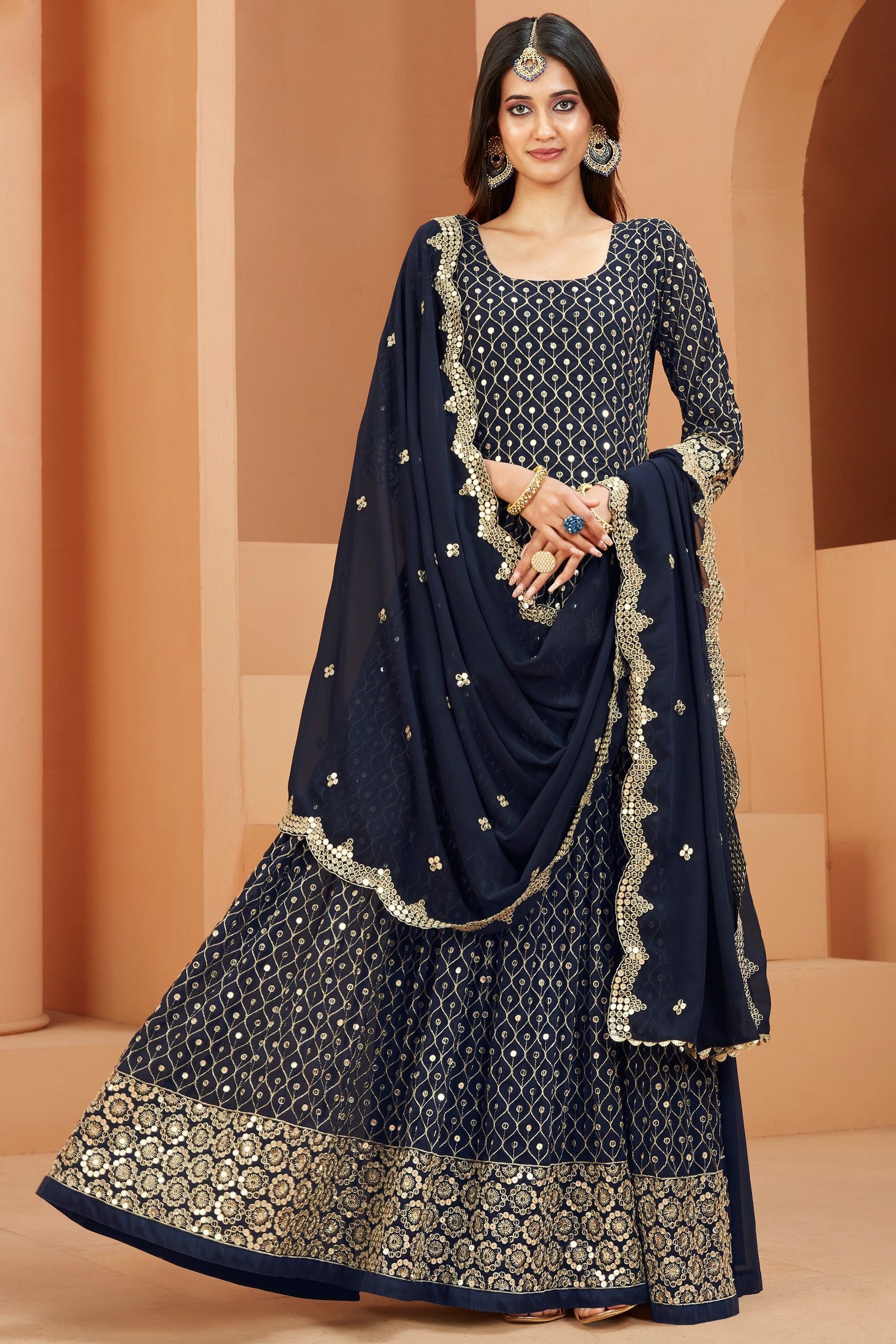 जॉर्जेट फैब्रिक सेक्विन वर्क सुंदर अनारकली सूट नेवी ब्लू रंग में