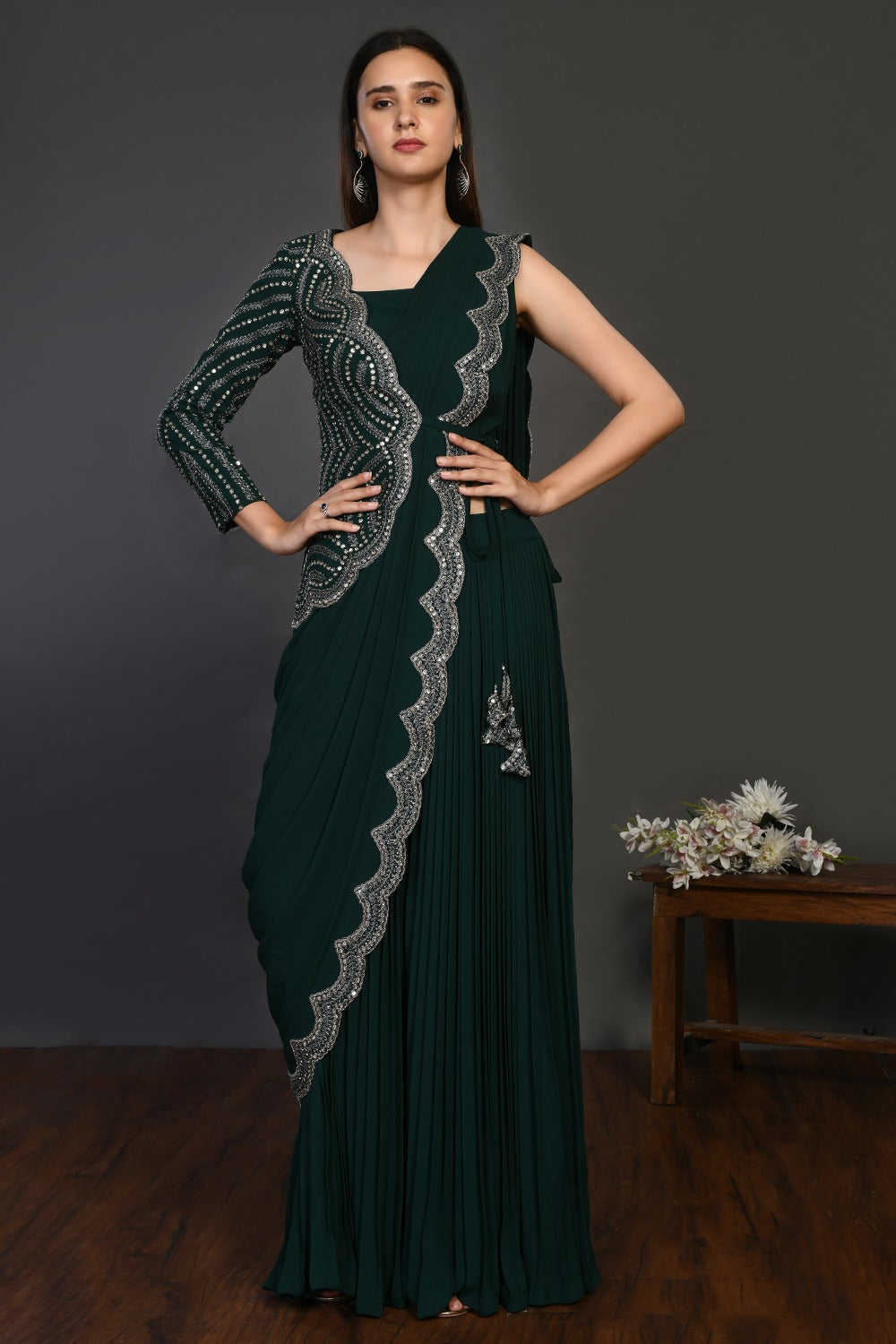 जॉर्जेट प्री-ड्रेप्ड पलाज़ो साड़ी सेट
