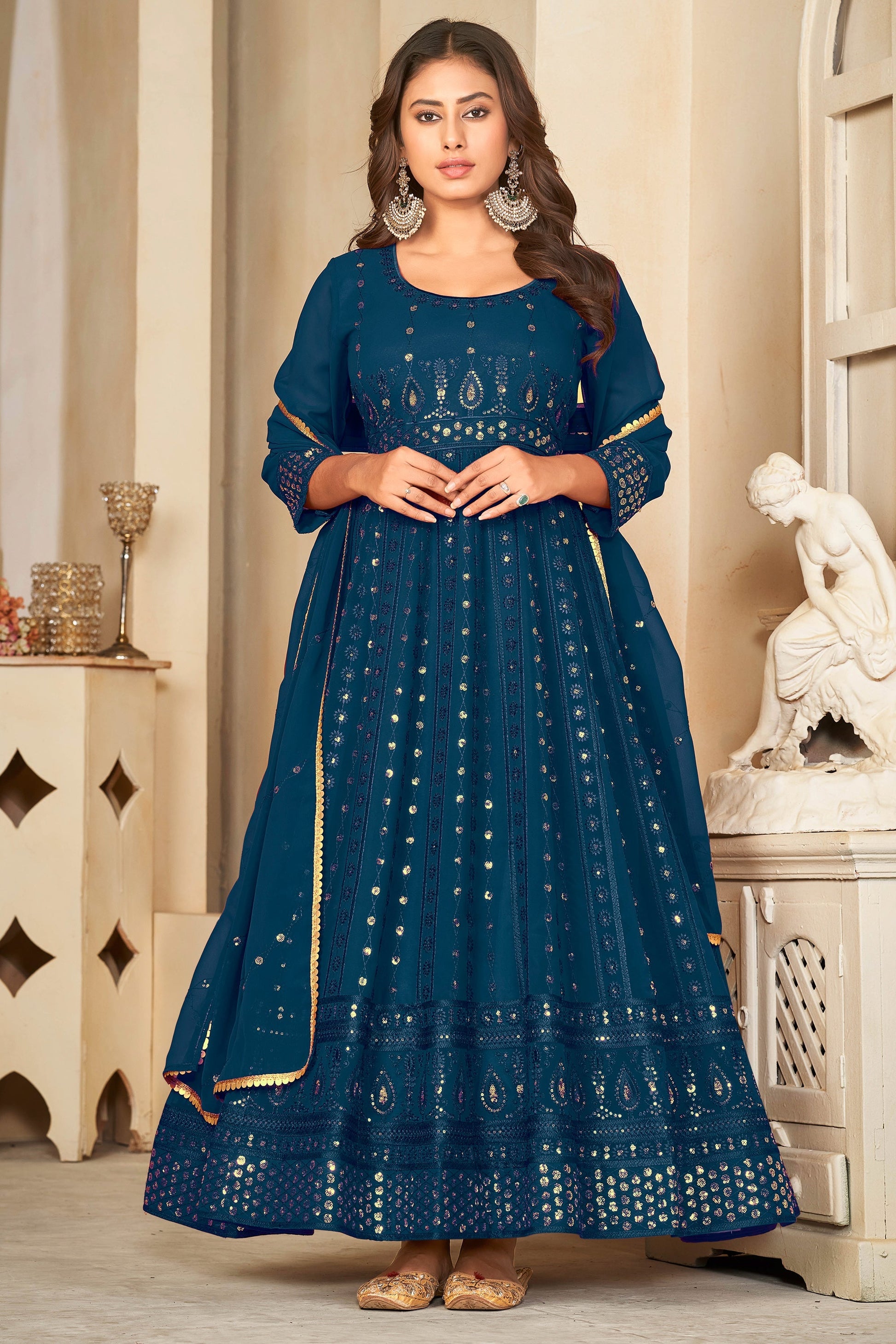 ग्लैमरस जॉर्जेट फैब्रिक टील कलर सेक्विन कढ़ाई अनारकली सूट