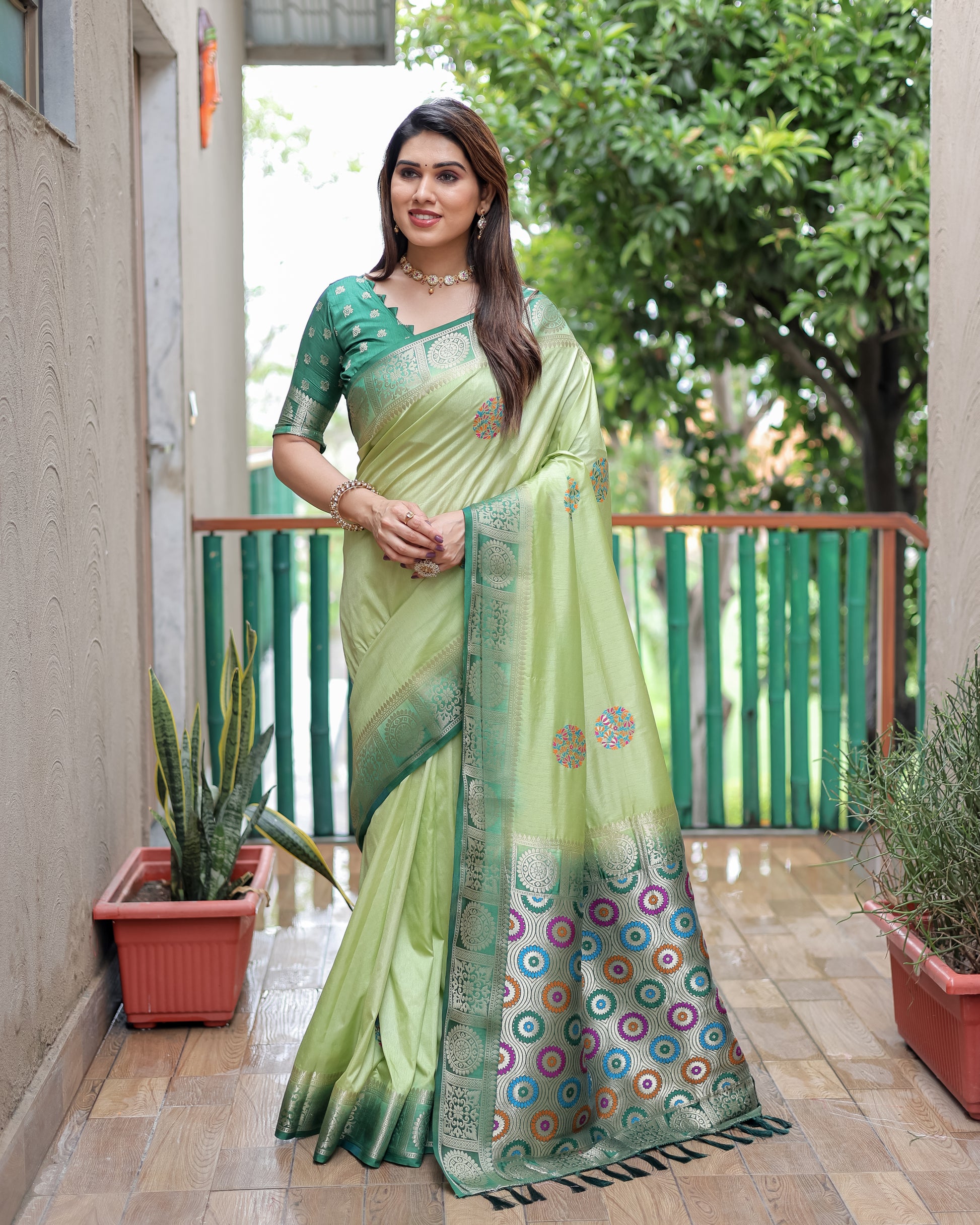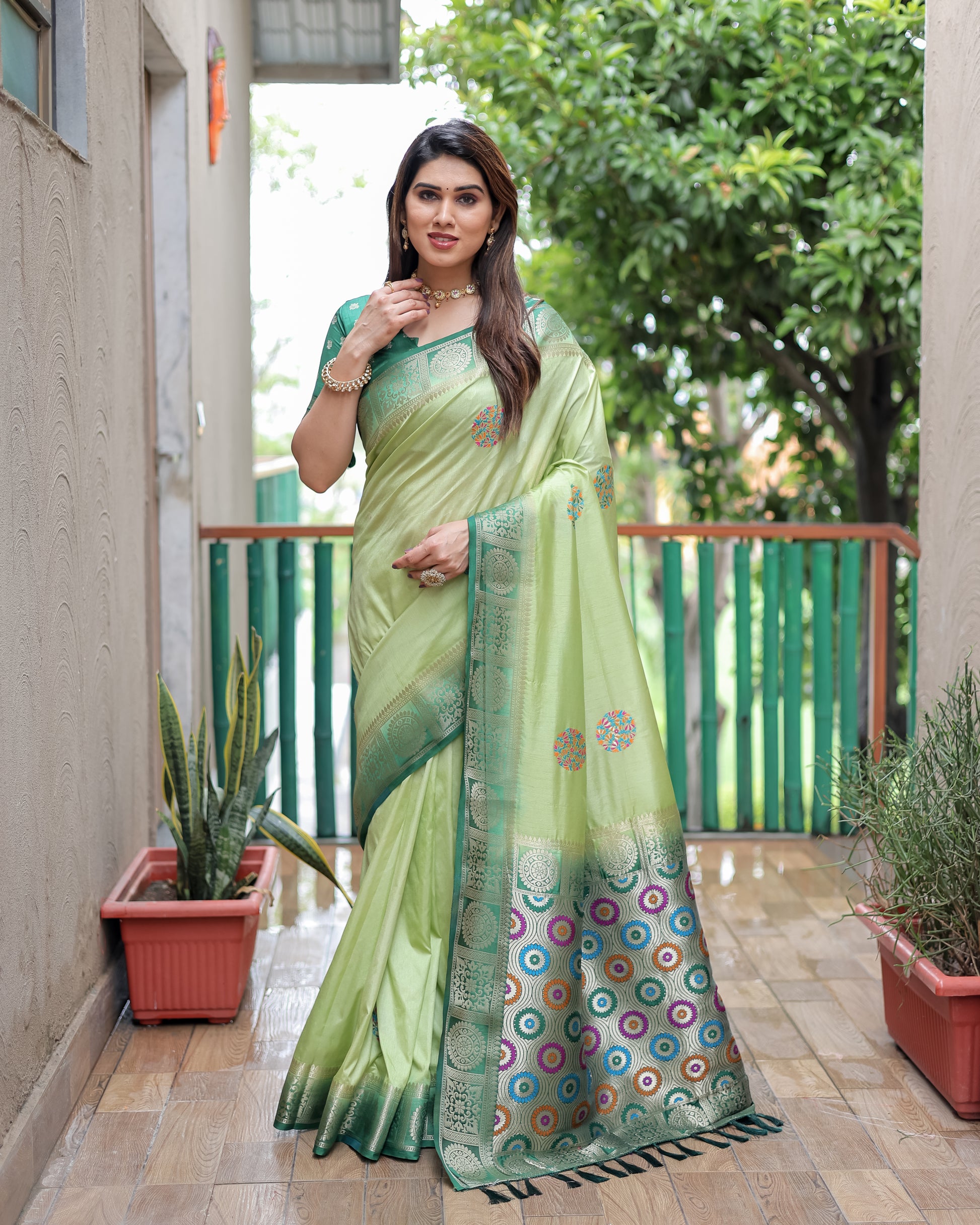 हरे रंग की खूबसूरत ट्रेंडी कलेक्शन डोला सिल्क साड़ी अनोखे बूटा डिज़ाइन के साथ